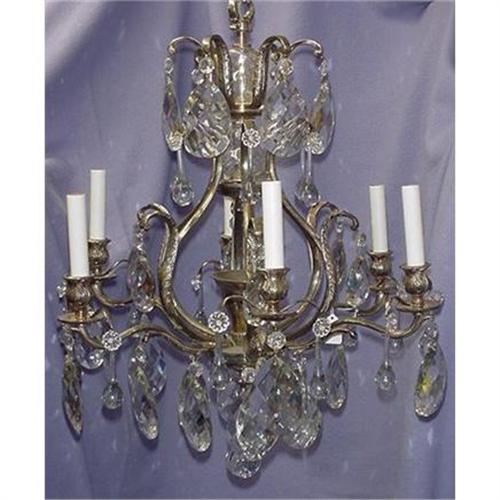 A early to mid 20th century silver plate and crystal chandelier, 27" tall, 22" in diameter, there are 24 - 4" beautifully cut and polished oval prisms, 18 - 3 1/2' teardrop prisms with rosettes and 6 - 3" oval cut prisms. There is a beautiful clear crystal ball at the bottom. The chandelier has 6 candle lights and one center light and has been newly wired with all new wiring and candle sockets with 4" white paper candle covers. The lamp is ready to be hung and used. A 5 1/4" matching canopy is included. The chandelier is an elegant piece and is of good size for any dining room, foyer, bedroom, etc. The condition is beautiful and just one of the 3" prisms has a small chip, the rest are in very good condition. (30)