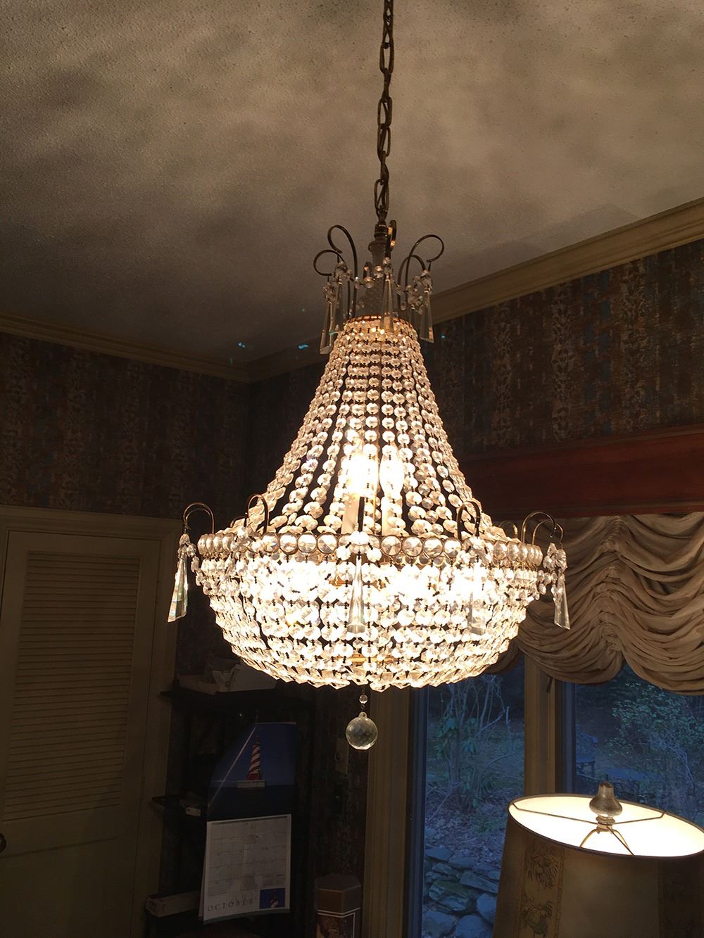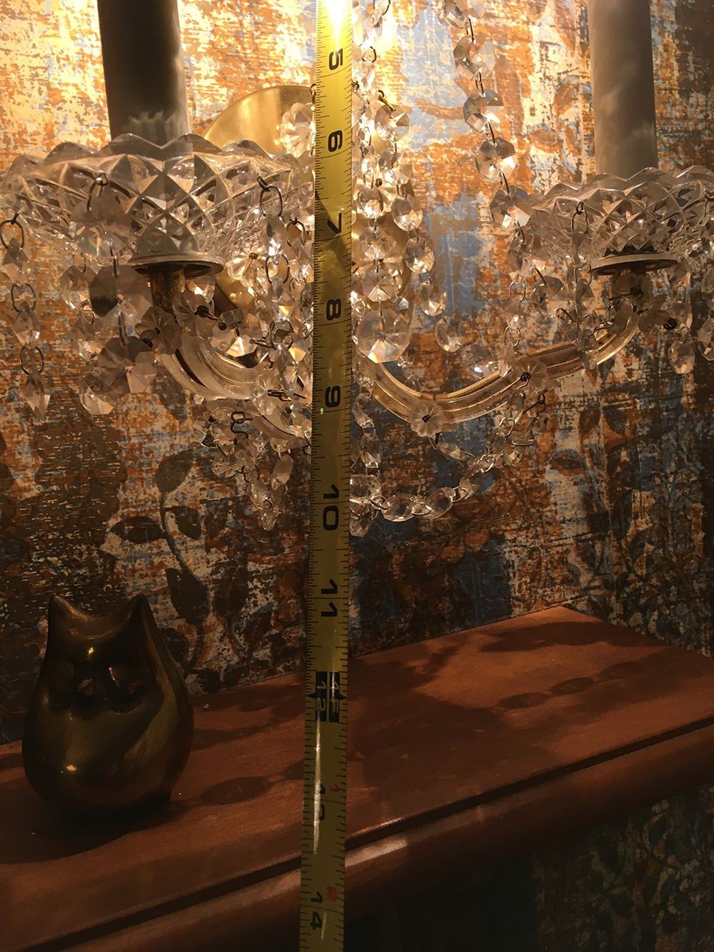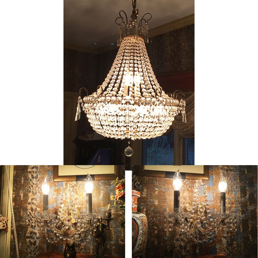 Beautiful crystal chandelier plus 2 matching crystal wall sconces. Chandelier measures approx. 42 inches tall, sconces measure approx. 12 inches tall each. pd