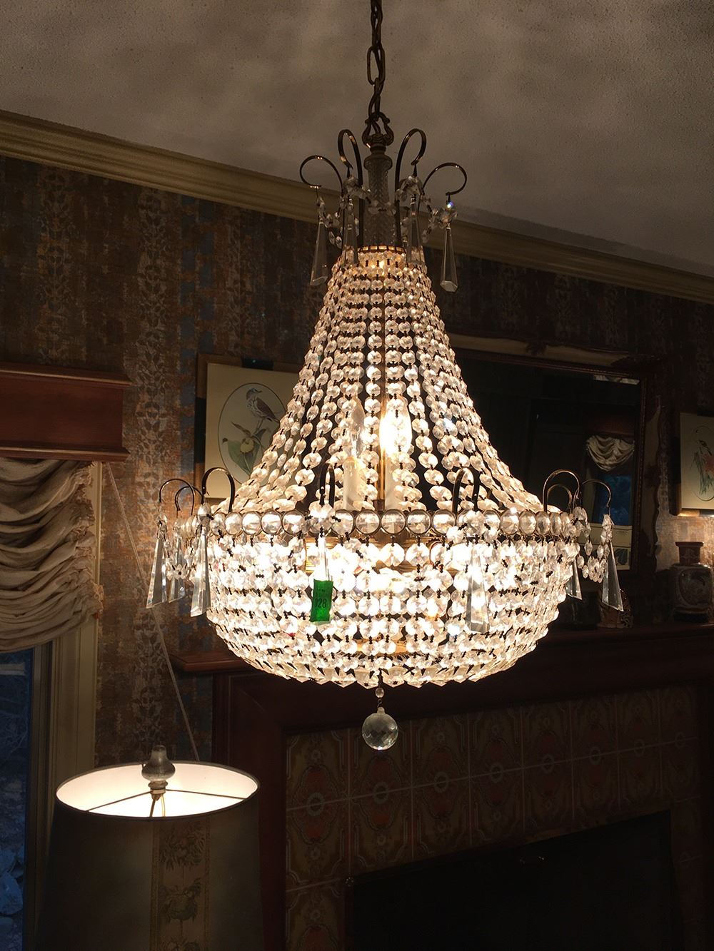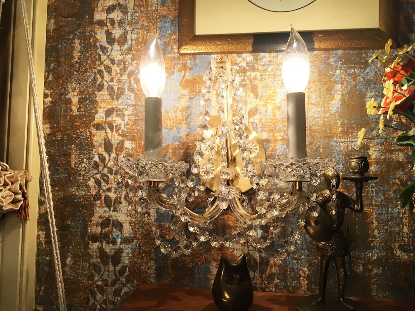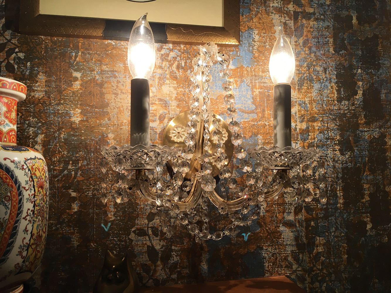 Beautiful crystal chandelier plus 2 matching crystal wall sconces. Chandelier measures approx. 42 inches tall, sconces measure approx. 12 inches tall each. pd