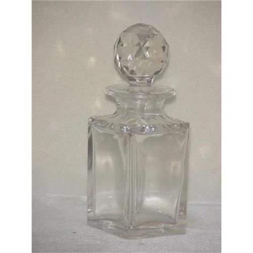 A crystal decanter with faceted ball stopper, 6'' tall, 2 1/8'' square. All surfaces polished, starburst on bottom. Tiny chips on inner rim where stopper fits.