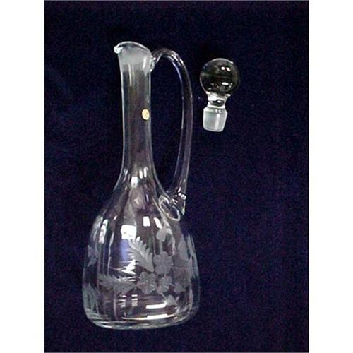 This is a very lovely set! The set consists of a large clear crystal decanter and 4 wine stems. All of the pieces are etched with a floral pattern, ferns and leaves. The decanter has a glass stopper, ball shaped at the top, and is approximately 15 ½ inches tall (including the stopper). The glasses are 8 ¼ inches tall, and three of them have intact stickers that read ?Made in Romania?. Two of the glasses have small flea bites, otherwise there is no indication of wear on the rest of the set.