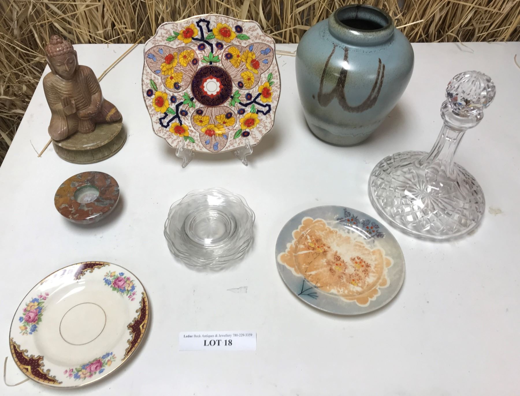 Crystal Decanter, Vase, Assorted Decorative Plates, Candle Holder, Buddha Statue