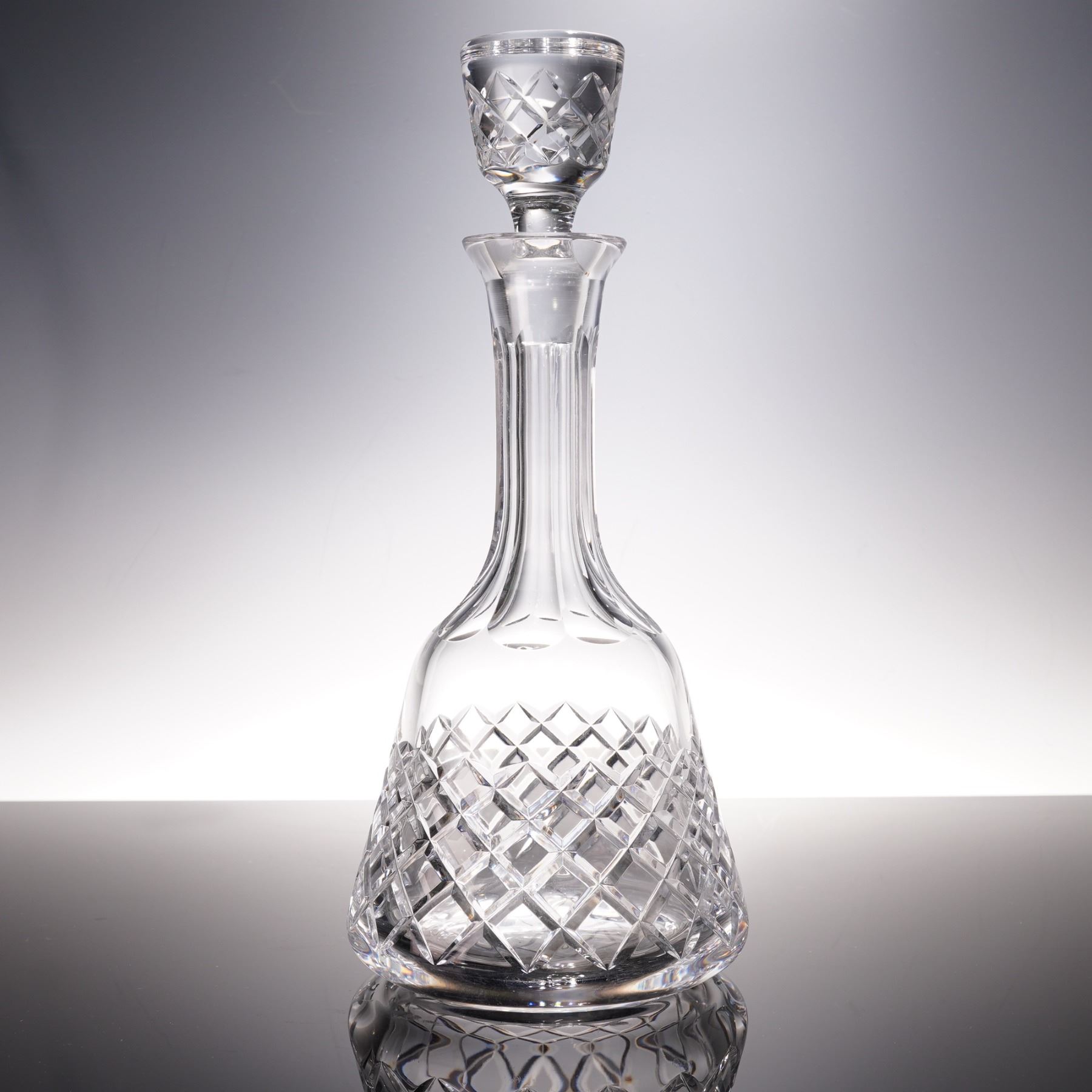 This tall, elegant crystal decanter with stopper features a beautifully faceted diamond-cut design, with the stopper matching the pattern of the decanter, showcasing intricate detailing and clarity.