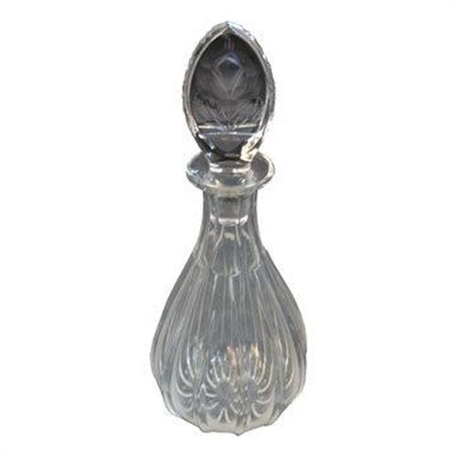 An 11" tall crystal decanter featuring an etched stopper with floral pattern. 4.25" in diameter, 1.8 lbs. No chips or cracks. Glass is slightly cloudy.