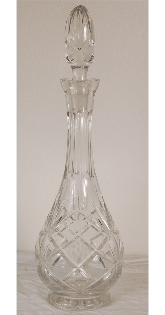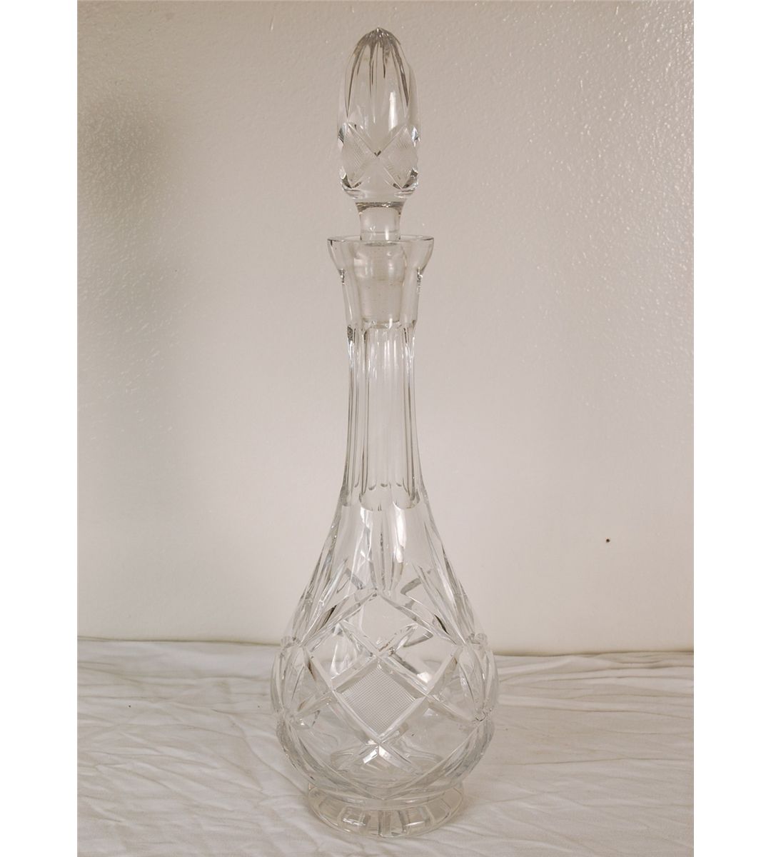 Beautiful crystal decanter with stopper and linear carvings. Minor chips in very bottom of stopper, unnoticable. Otherwise in excellent condition. 16" x 5".