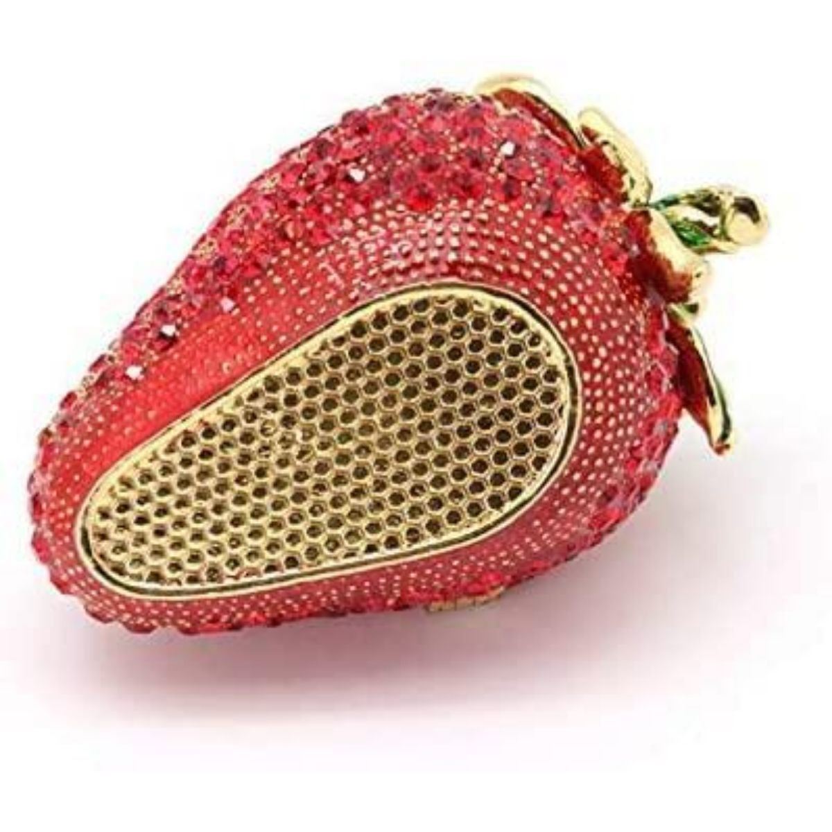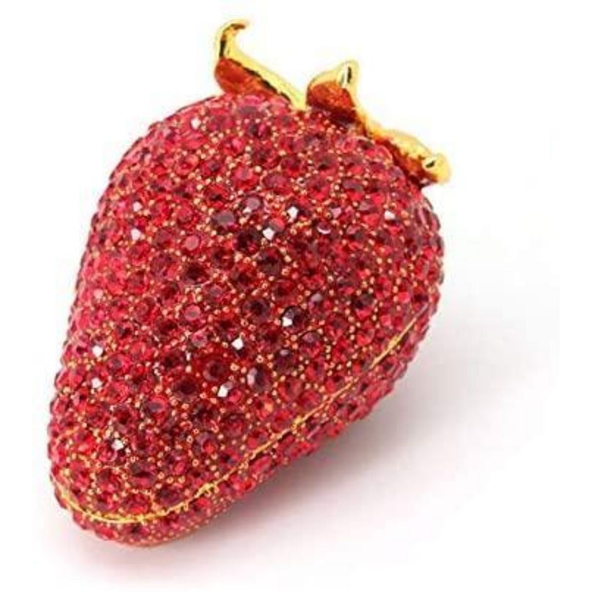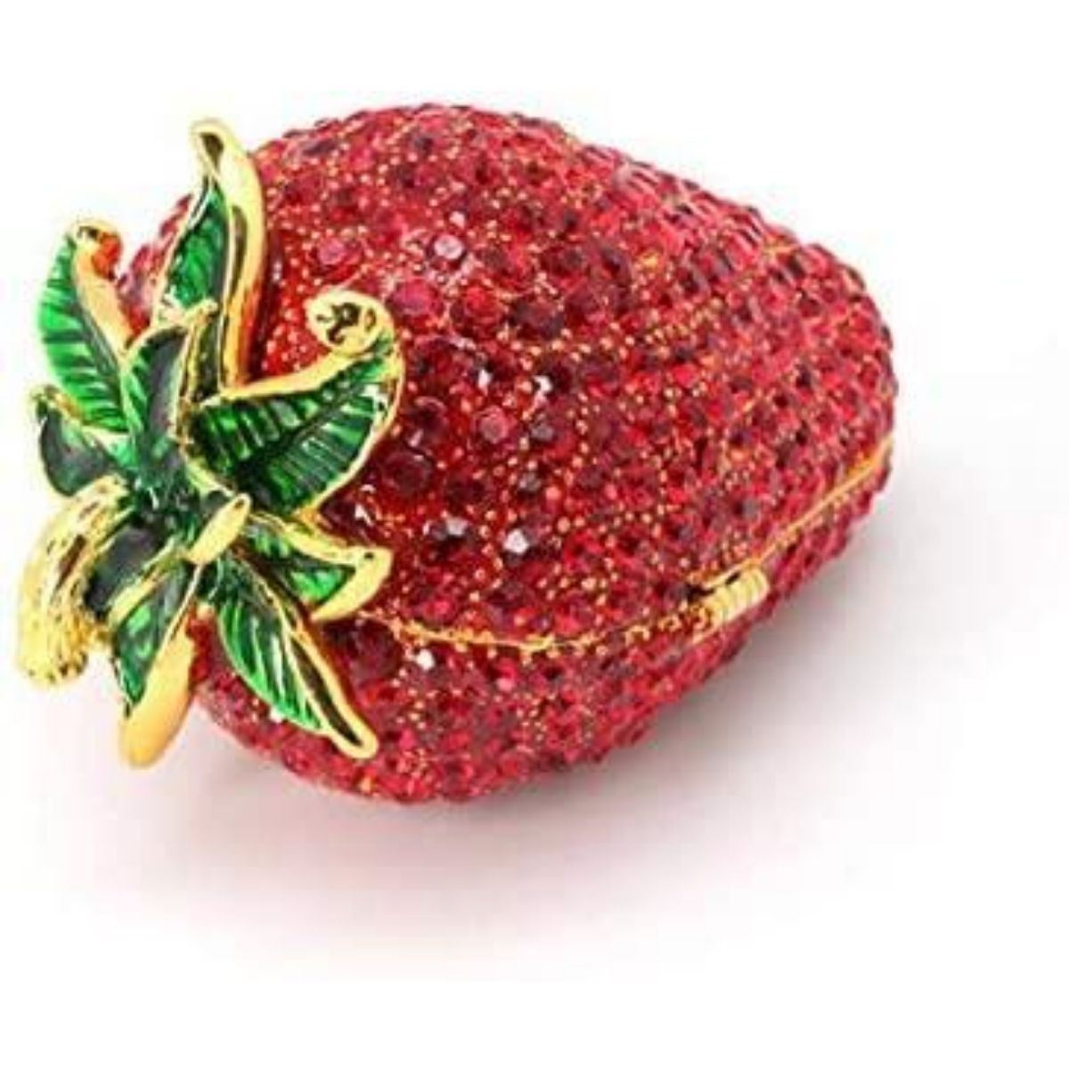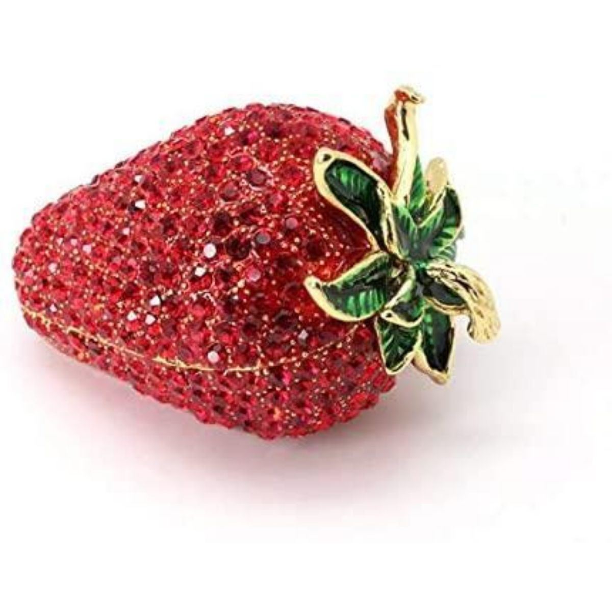 Strawberry fruit form trinket, jewel box. Enamel & gilt over pewter, encrusted with Austrian crystals. The top of the fruit opens, on a hinge, with magnetic closure, to reveal an enameled interior for storing trinkets or jewels. 1 3/4" L X 2 1/2" W X 1 1/2" H.