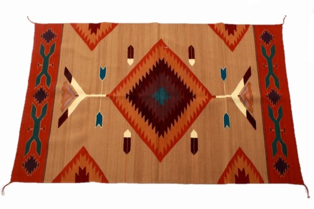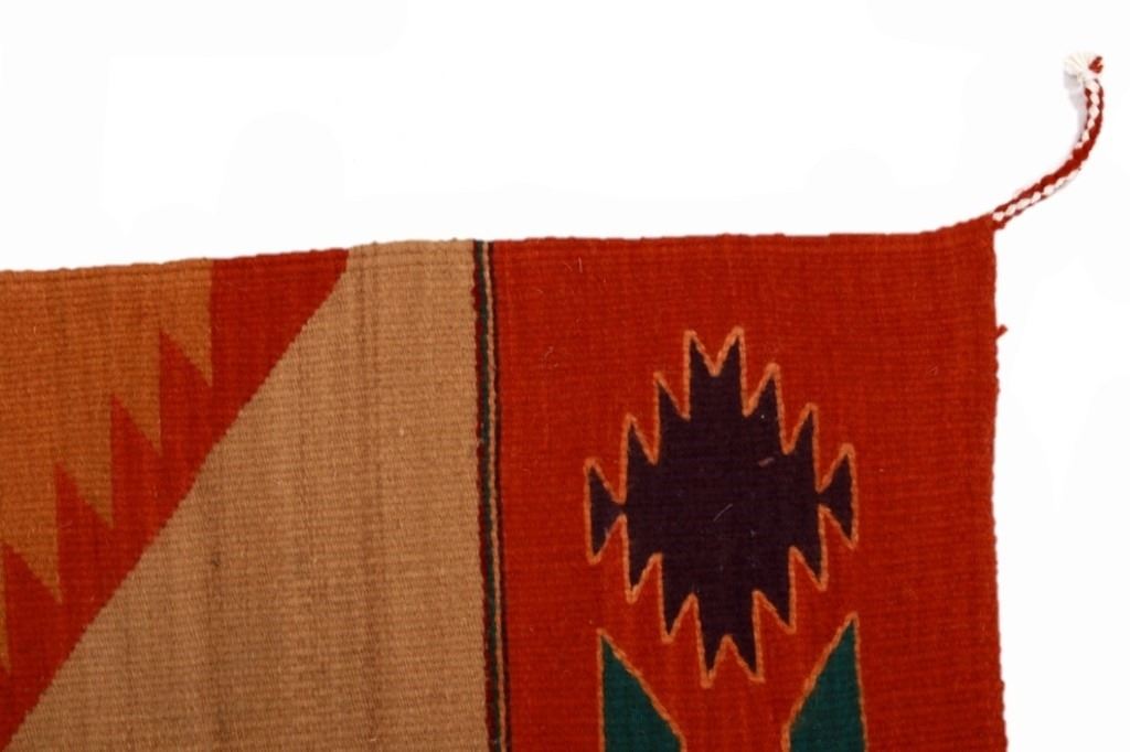 This is an excellent hand-woven flat weave rug by master weaver, Nico Gutierrez. The rug was made using 100% soft, fine, hand spun wool yarns in a beautiful Crystal Eye Dazzler pattern. The rug was hand woven with a tight weave using 100% wool blend, which offers natural variegation and durability with color fast aniline dyes. The tight, hand-woven weave, displayed with natural fleece tones, is in the fine Crystal Eye Dazzler pattern of the time-honored Zapotec, multi-generational craft by a master weaver, Nico Gutierrez. This rug shows iconic Zapotec design with thick, symmetrical Crystal Eye Dazzler design, a bright and greasy orange, red crystal eye dazzler medallion decoration design, and stripe decorated bands with designs in green, purple, and cream geometric shapes along the border. The piece is brand new, in pristine condition, with a fine, tight weave. The rug measures 4’ by 6.5’ (4 foot by 6 foot 5 inches). This is a brand-new rug.