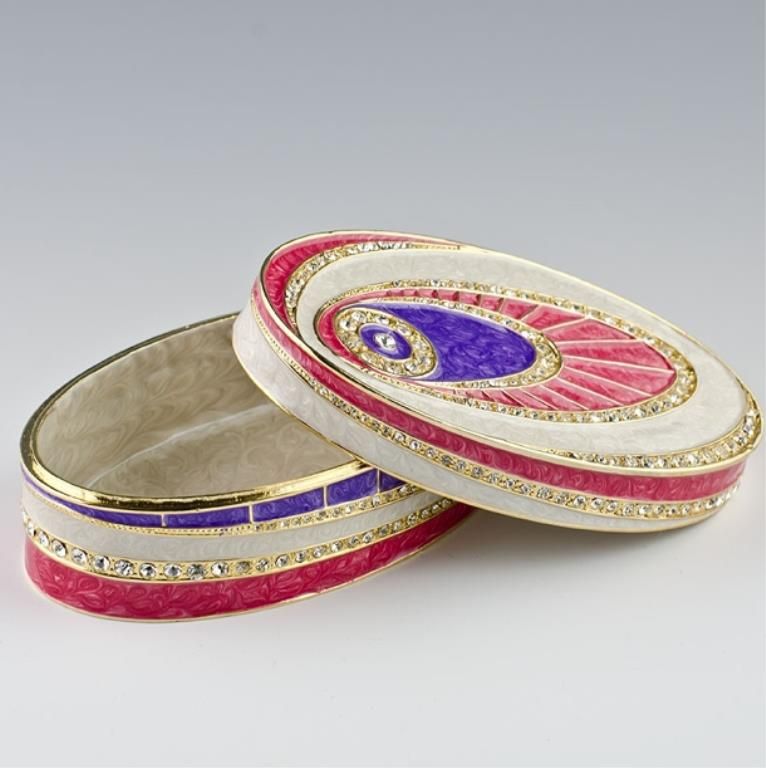 This box has blue translucent enamel under the crystal ornamentations in the form of crosses. Faberge?s superb enameling technique is regarded as one of his main contributions to art at the end of the last century. These wave (moir?) designs are a common type of guilloche work on enameled articles by Faberge. The inside of the box is covered with blue enamel. The royal glossy blue in the inside makes this box the perfect jewelry storage place! 4.5'' (L) X 3'' (W) 1.75" (H) Pewter, Crystals, Enamel Faberge is a trademark of Pallinghurst Resources LLP. This piece of art should not be associated with Pallinghurst Resources LLP, Faberge Limited Co. who acquired the Faberge trademark in 2007. This item is an exacting replication of a piece of priceless value.