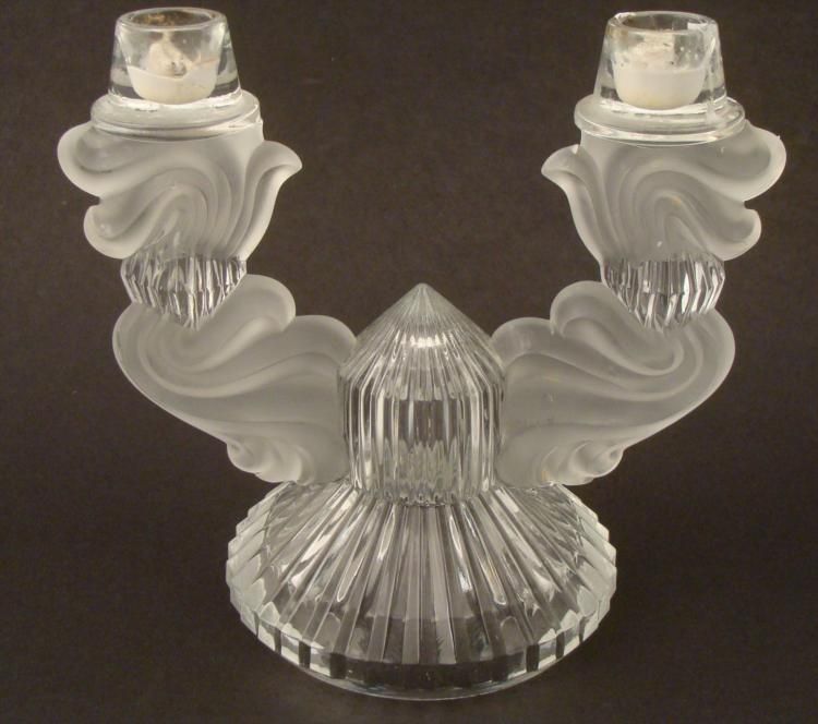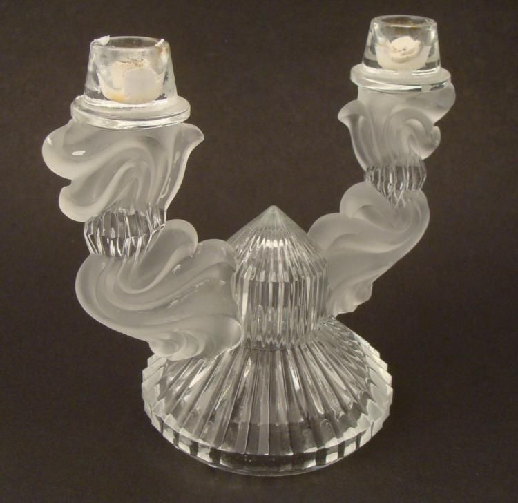 This candelabra is crystal with a faceted pattern, along with frosted glass contrasting in flowing designs, like billows of candle flame smoke. It is elegant and artfully styled, and sure to bring a special glow to any room. * * Dimensions: 8" high x 8 1/4" wide; base is 5" in diameter; candle openings 7/8" in diameterCondition: Excellent ; some wax residue and singed marks around candle openings- should clean up fine *