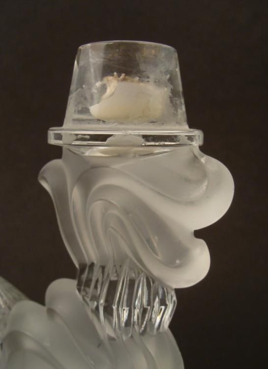This candelabra is crystal with a faceted pattern, along with frosted glass contrasting in flowing designs, like billows of candle flame smoke. It is elegant and artfully styled, and sure to bring a special glow to any room.Dimensions: 8" high x 8 1/4" wide; base is 5" in diameter; candle openings 7/8" in diameterCondition: Excellent ; some wax residue and singed marks around candle openings- should clean up fine