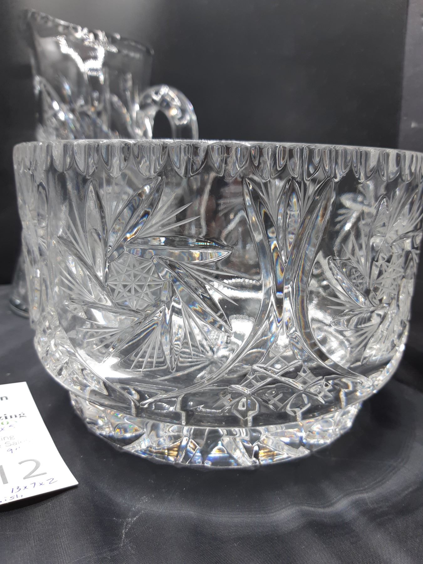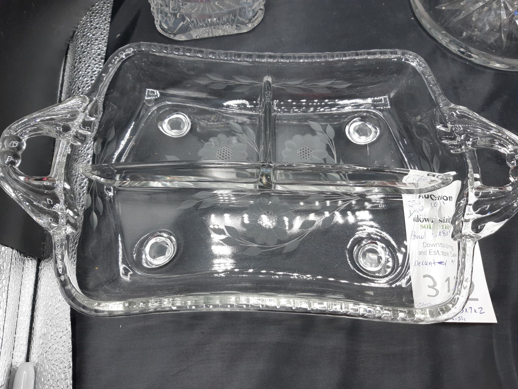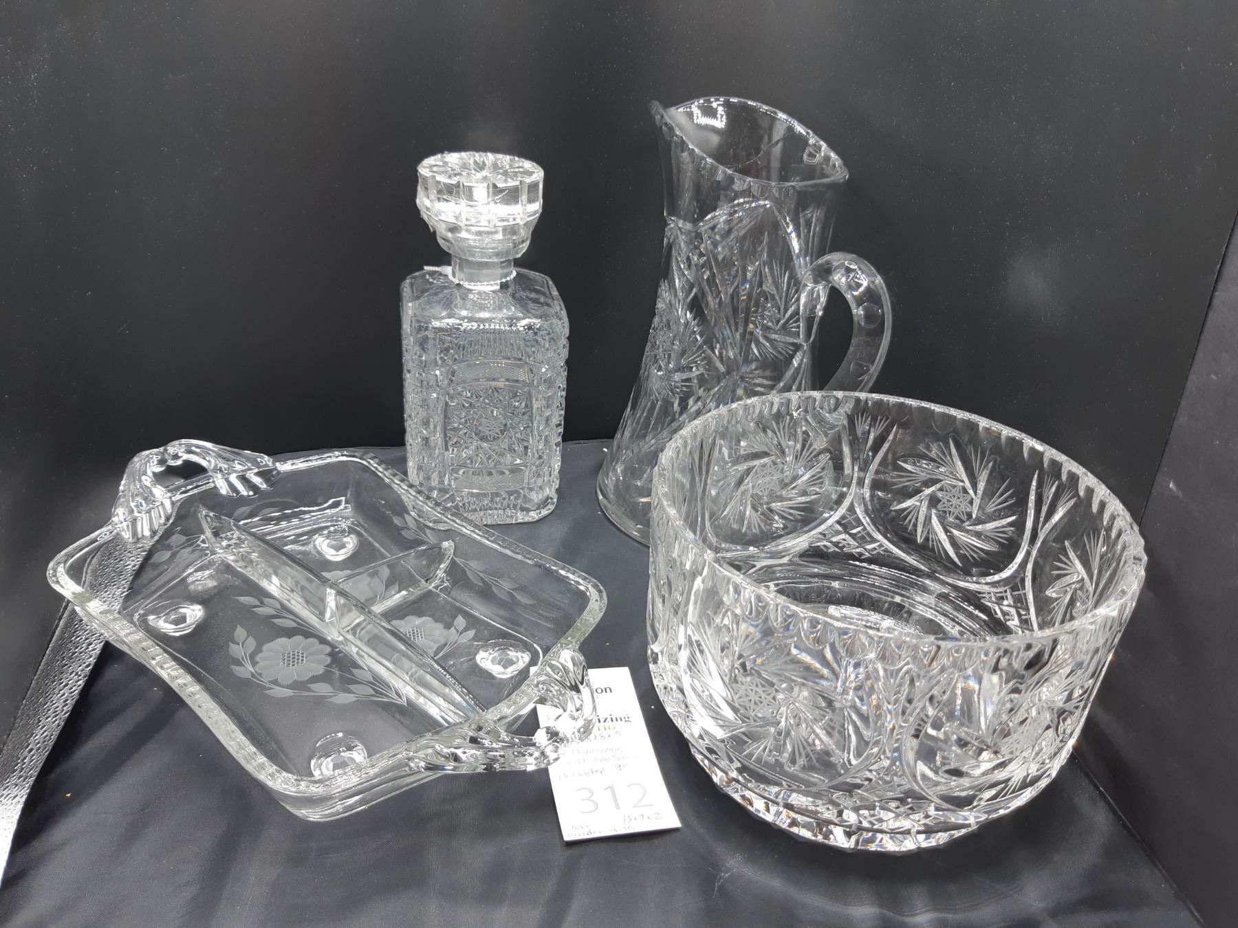 Jug 10", Bowl 8x8x5, Decanter 9" and Glass divider dish 13x7x2. Bring packing material and pickup at 9 am