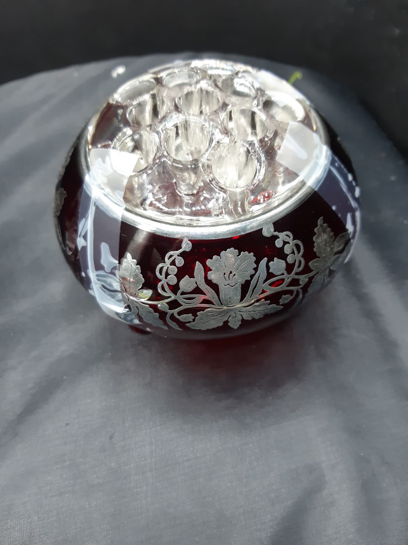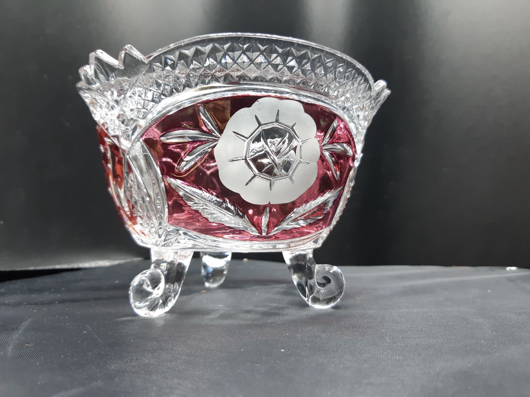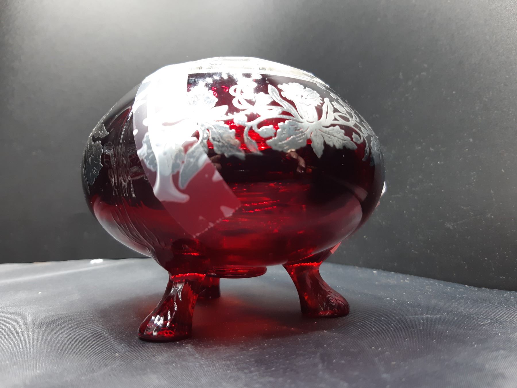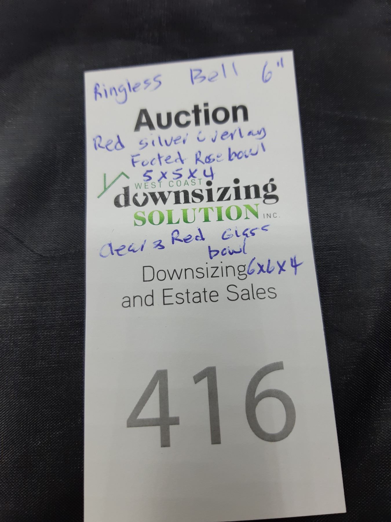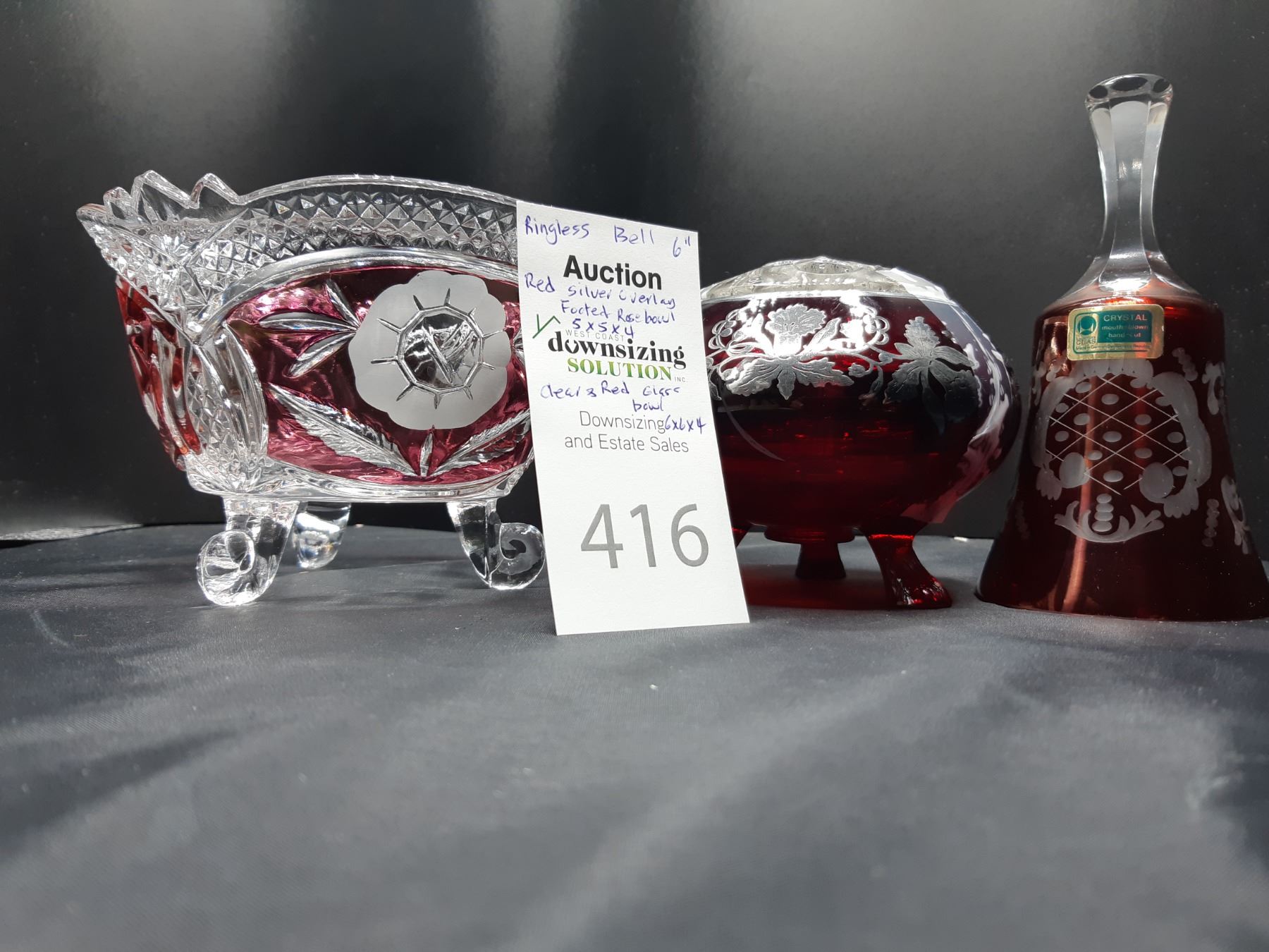 Ringless Bell 6", Red with silver overlay footed rosebowl 5x5x4, clear red glass bowl 6x6x4 Bring packing materials and pickup at 10 am