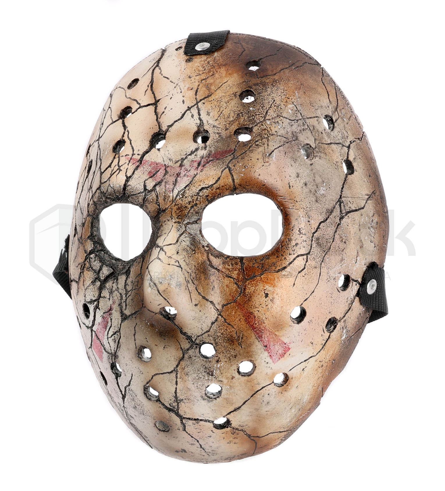 Hero mask used by the famous serial killer Jason, and made for use in the unreleased pilot for the CW original series Crystal Lake Chronicles. The series, which was under development before it was cancelled brought the killer Jason Vorhees back to Cap Crystal Lake, the original setting of the 1980's horror film. This piece was created by Sota F/X for the series and features a very worn and cracked version of the signature serial killers mask. Made of fiberglass, this piece is white in color with red detailing and cast in chip and crack details. The mask features three black nylon straps on the sides and top to hold it to the actors head. Although this piece did not make it on film it remaisn in excellent, production made condition.