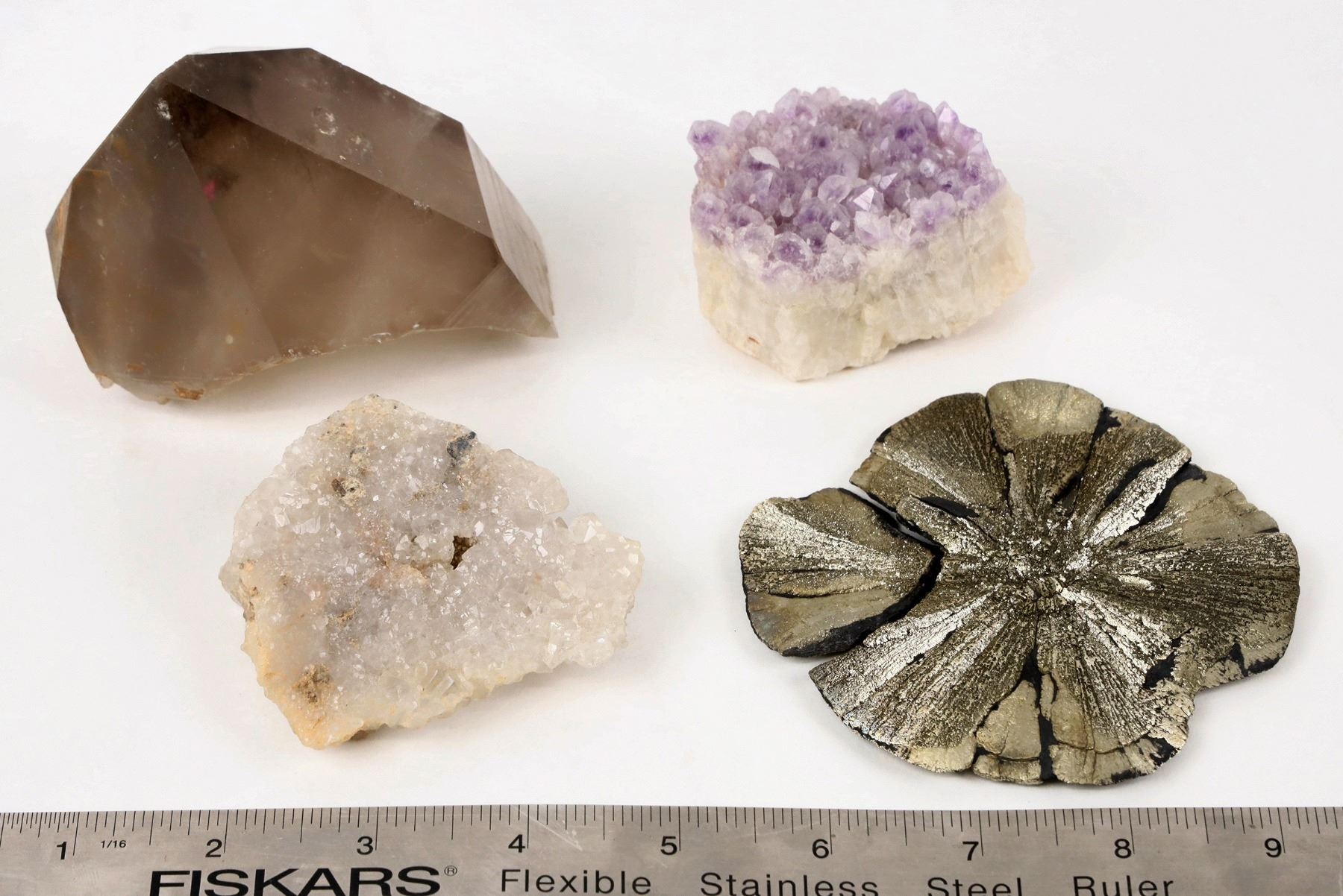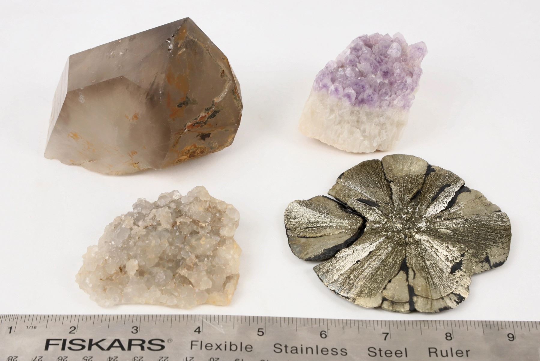 Crystal Mineral Group: 1) Smokey Quartz 3 x 3 x 3 inches 2) Quartz Cluster, Coyote Creek 3 inches 3) Amethyst, Humboldt County, NV 2 x 2 inches 4) Pyrite Sand Dollar from Illinois, one side broken about 3 inch diameter.