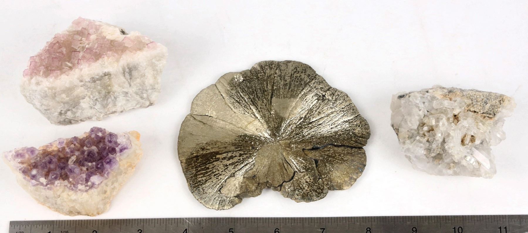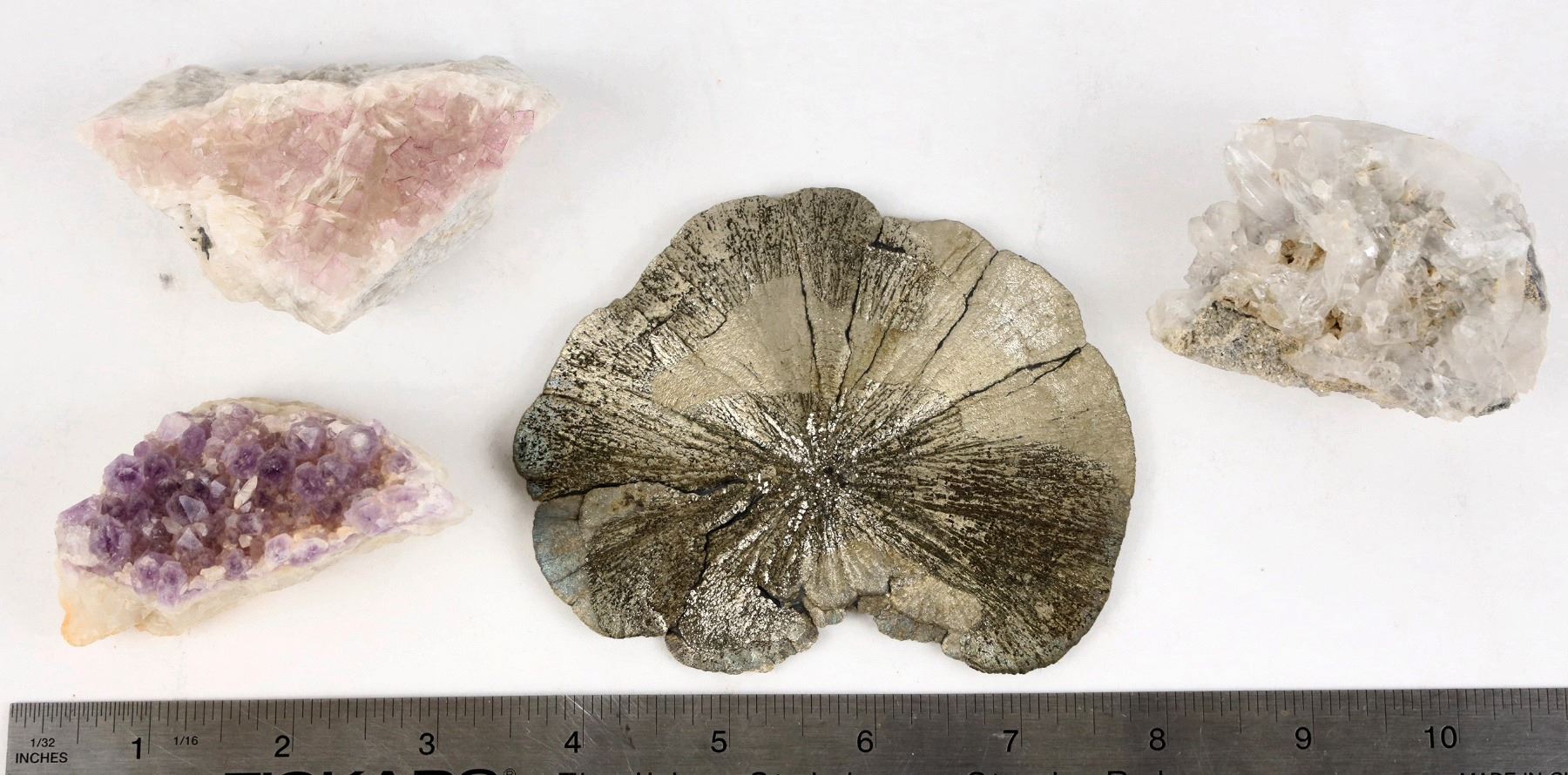 Quartz Cluster from Coyote Creek, Amethyst from Humboldt County, Fluorite from Kentucky, Pyrite Sand Dollar from Illinois.