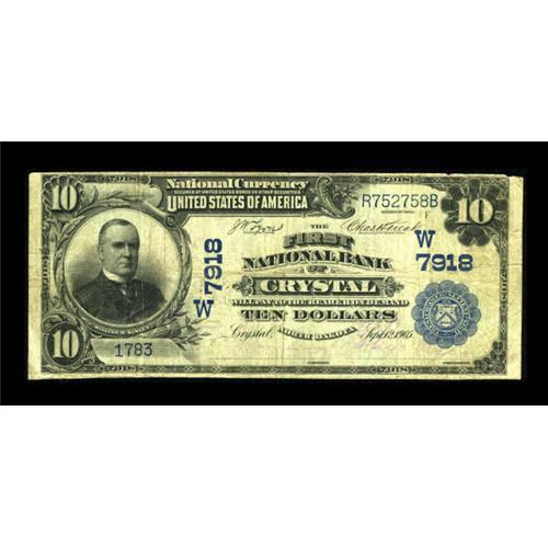 <B>Crystal, ND</B></I> - $10 1902 Plain Back Fr. 624 <B>The First NB</B></I> Ch. # (W)7918<BR> Large notes only from this excessively rare bank, which has had only one offering at public sale since 1983. This is the third note known from here, and, with both of the others having been ensconced in long term holdings, may offer collectors their only opportunity to add any note from this one bank location to their collection for the foreseeable future. Pleasing <B>Fine+.</B></I><BR><BR><b>Shipping:</b> Coins & Currency (<a target="_blank" href="http://www.heritageauctions.com/common/shipping.php">view shipping information</a>)