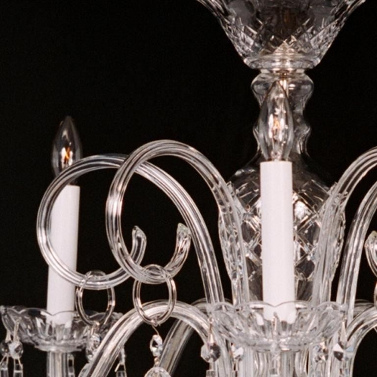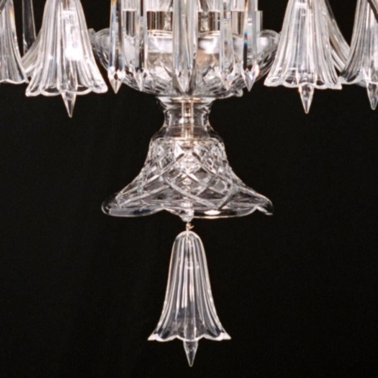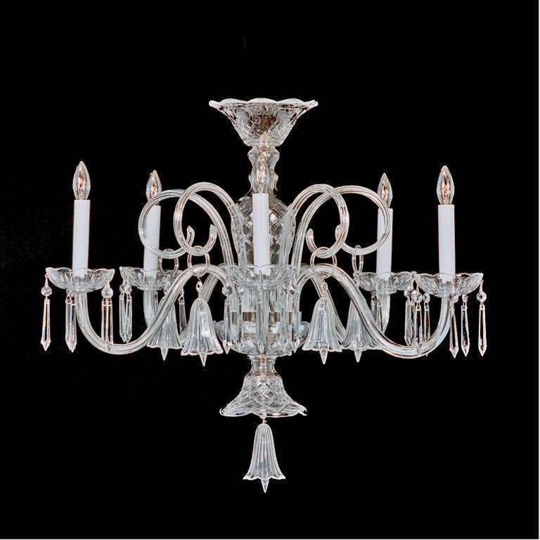 Whimsical romantic design, hand blown & cut crystal bells hang from each of the five ribbed & scrolled arms, as well as the bottom. Electric wired, new chandelier in perfect condition. 1' of adjustable chain