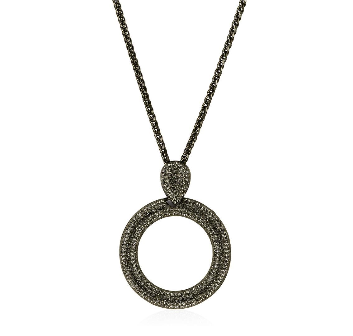 High end designer jewelry. Crystal Pave Circle Pendant Necklace - Silver. Chocolate Metal Chain L. Necklace. Choc/ Smoky. 32/2.5inches. Total Weight: 58.5 grams.