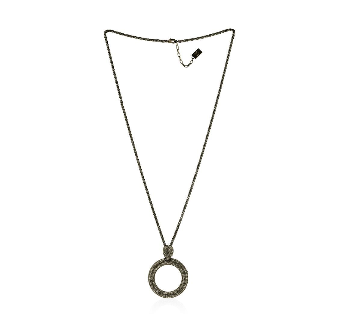 High end designer jewelry. Crystal Pave Circle Pendant Necklace - Silver. Chocolate Metal Chain L. Necklace. Choc/ Smoky. 32/2.5inches. Total Weight: 58.5 grams.
