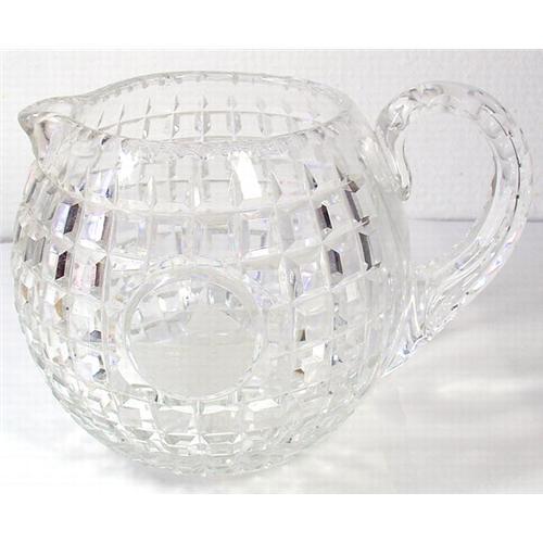 Sparkling round cut crystal pitcher. In the circular reserve on the side there is an incised golf flag marked "19," symbolizing the pitcher's use as a 19th hole at the end of an 18-hole round of golf. The pitcher itself is cut in a simple classic geometric design of squares with a sunburst motif on the bottom.