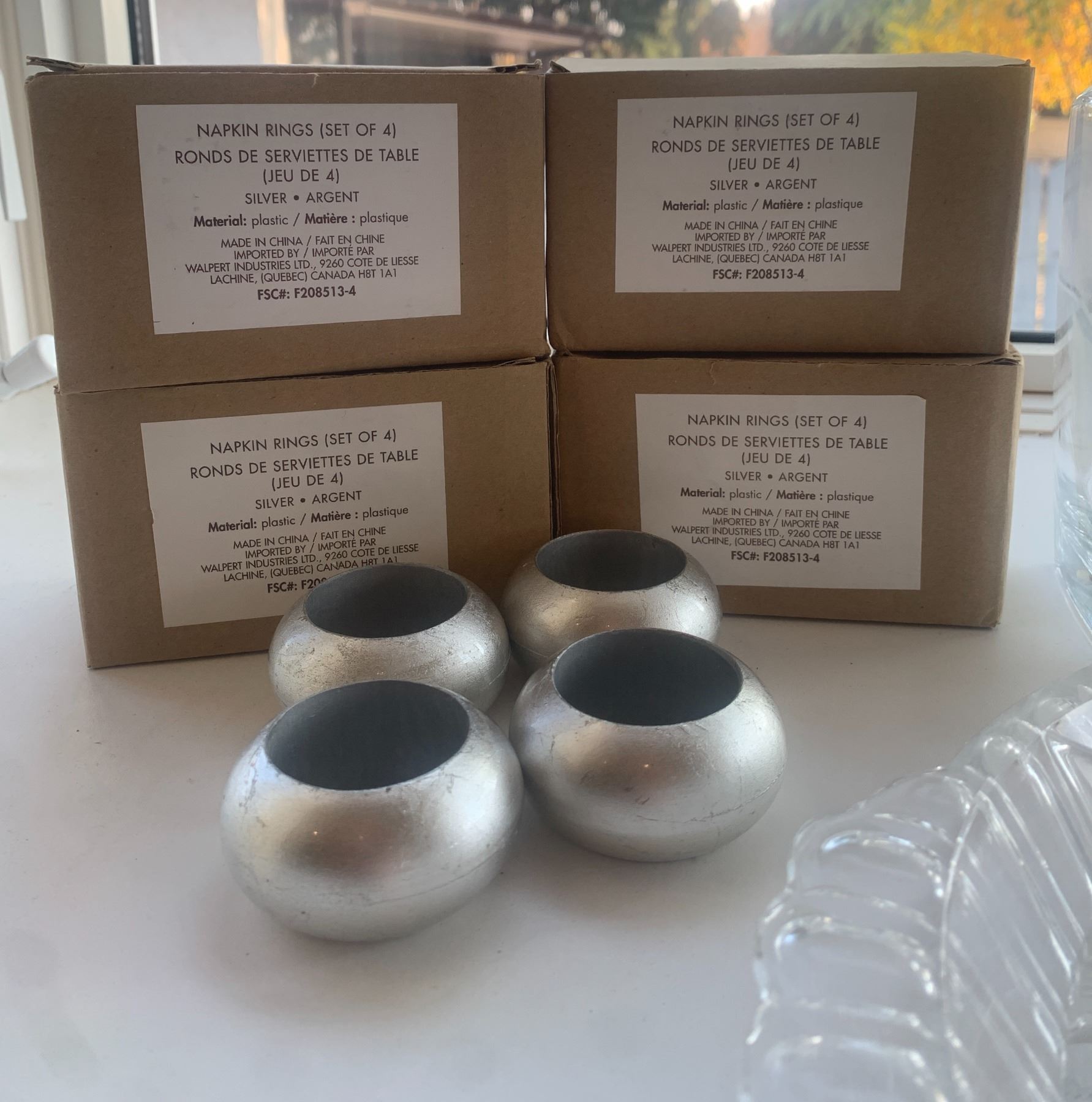 Crystal Platter, Glass Decanters, and 4 sets Napkin Rings
