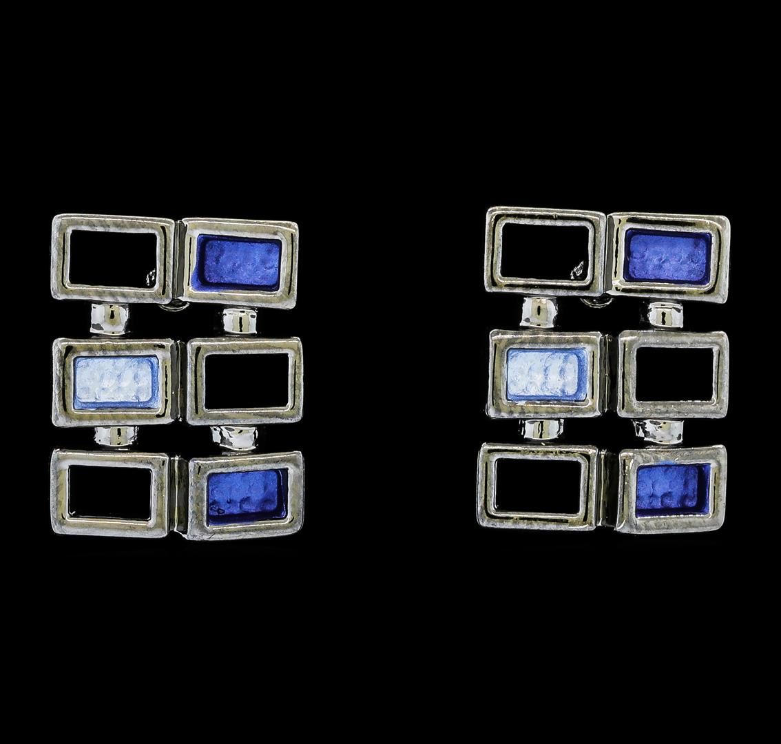 High end designer jewelry. Crystal Rectangle Earrings - Rhodium Plated. Blk Rhodium Plated Metal/1" Dangle. Gun Met/ Blue. Post. Total Weight: 4 grams.