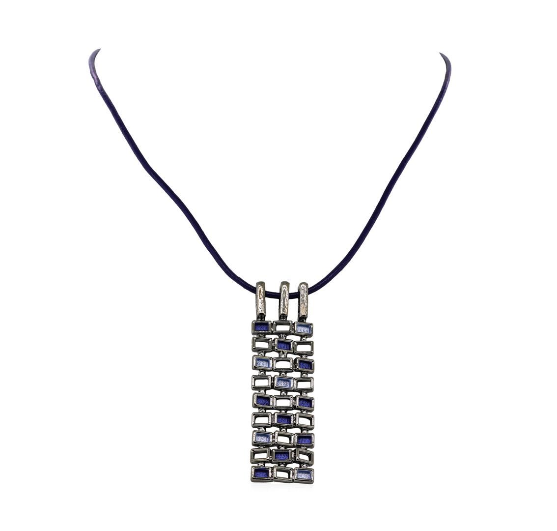 High end designer jewelry. Crystal Rectangle Pendant Necklace - Rhodium Plated. Blk Rhodium Plated/3" Ext Clasp/ Navy Leather Cord. Gun Met/ Blue. 16inches. Total Weight: 14 grams.