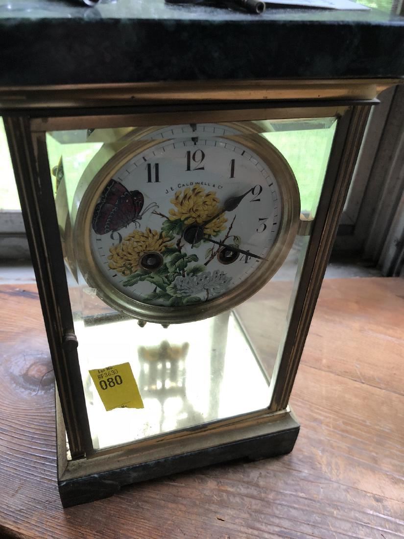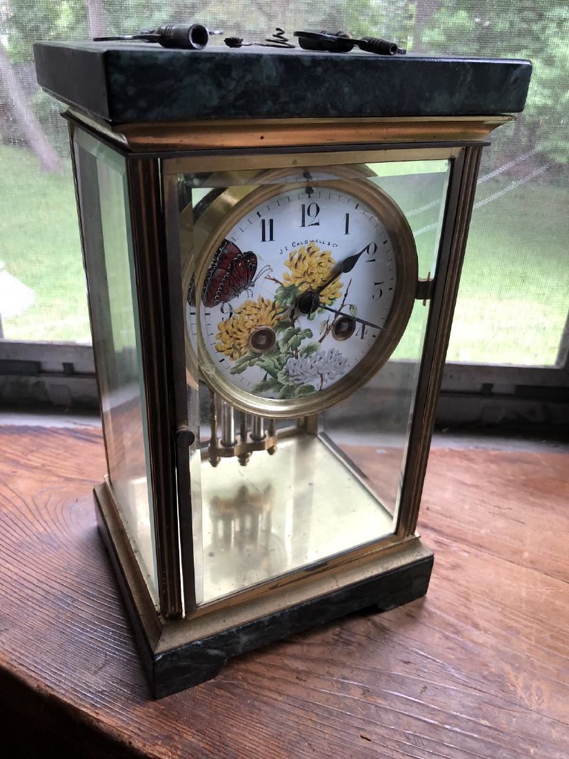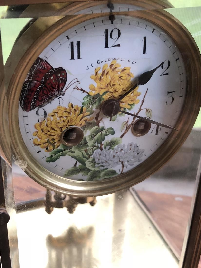 Crystal Regulator Clock J.E. Caldwell and Co. Handpainted dial with flowers and 2 butterflies, with marble and glass. (RL)