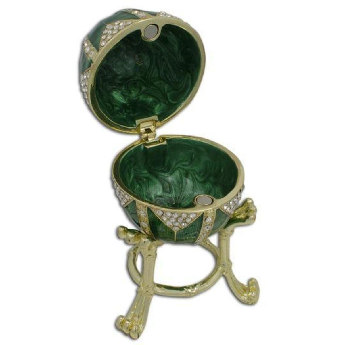 3.15" Crystal Rhombus on Green Enamel Royal Inspired Russian Egg 3.15 Inches Tall Hand painted Enamel Gold Plated Pewter, Austrian Crystals Gift Boxed This hand-painted sparkling egg is adorned with clear crystals and high-polished enamel with golden trim. The egg opens on a hinge and closes shut with a magnet, to keep the box securely shut. The piece comes in a beautiful gift box. It is an excellent decorative piece of artwork.