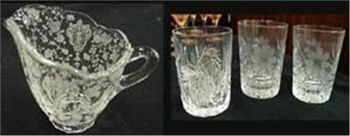 Crystal Rose Point Creamer by Cambridge Glass and three cut crystal tumblers all in good condition