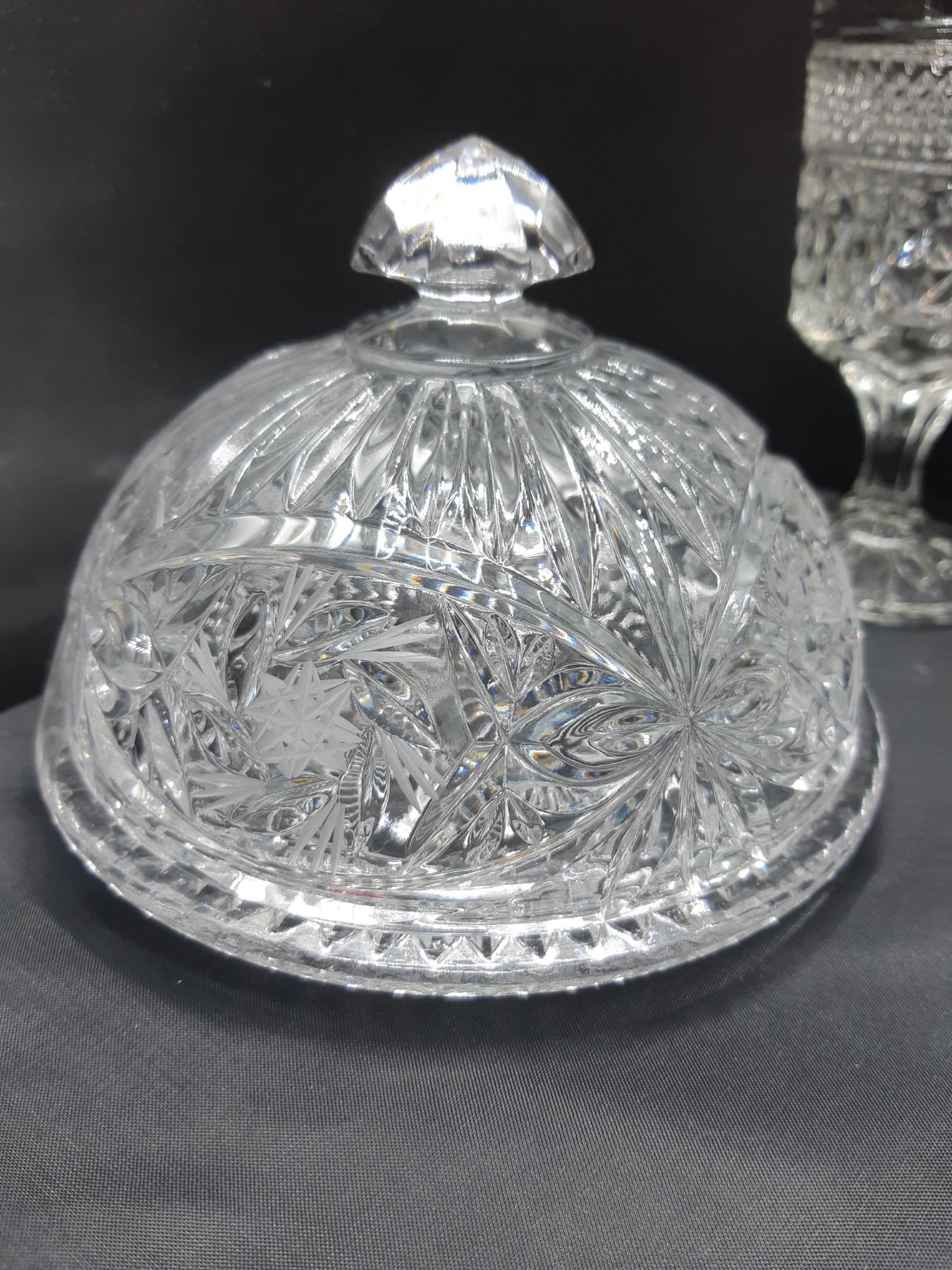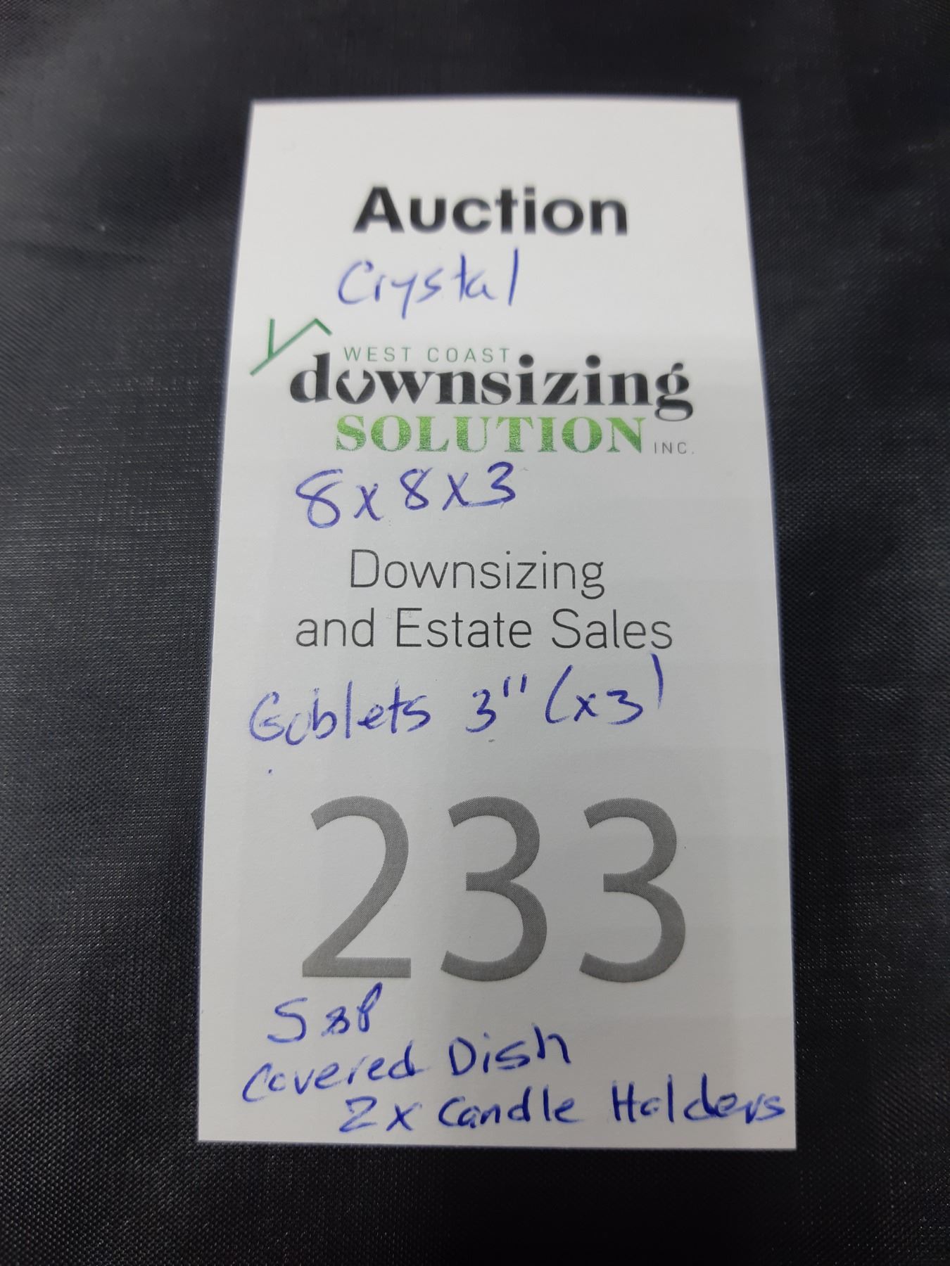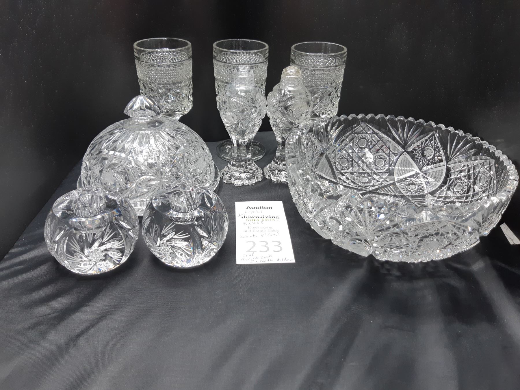 Large bowl 8x8x3, 3 Cut glass goblets 3", Crystal S&P, Covered Butter Dish & 2 candle holders Bring packing material and pickup at 9 am