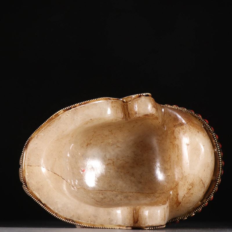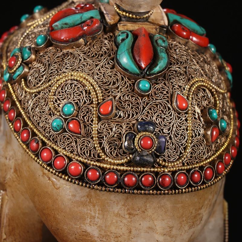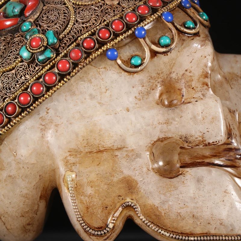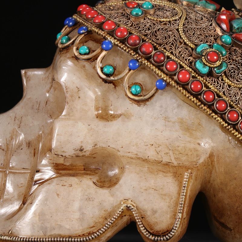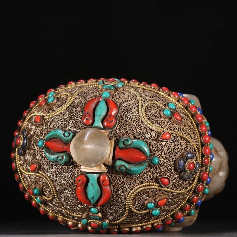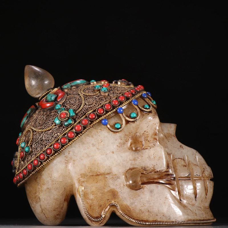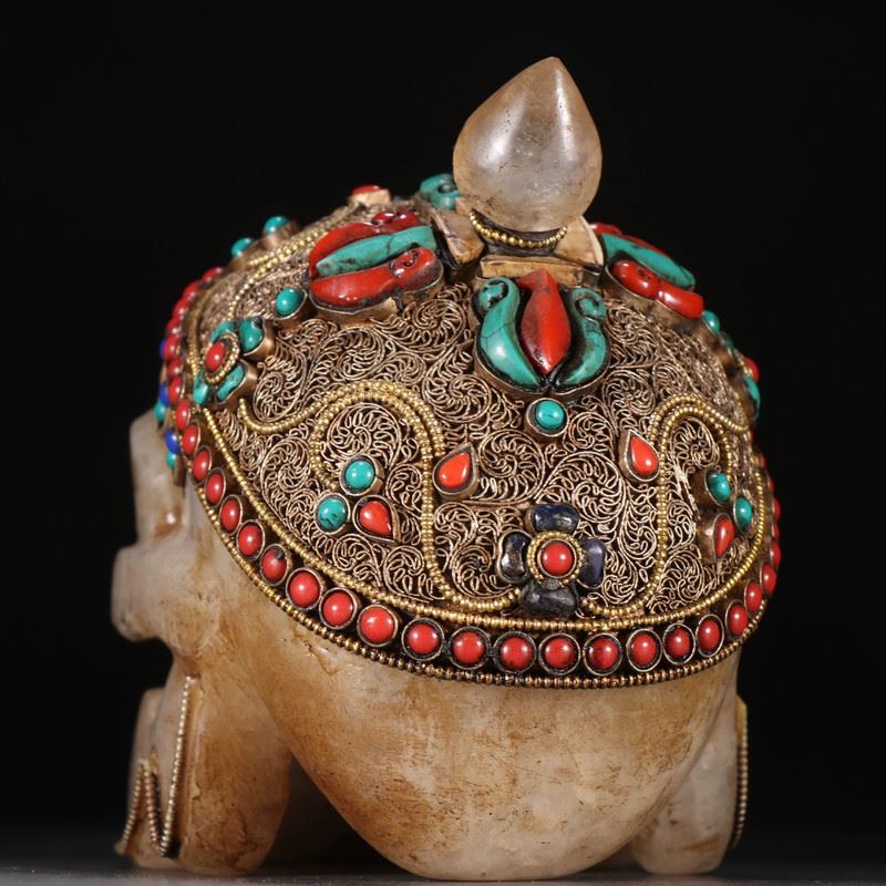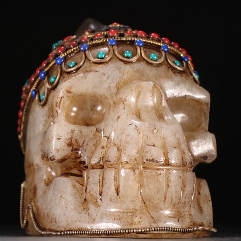 A finely crafted crystal skull adorned with intricate cloisonné filigree and inlaid with vibrant gemstones. The piece features a decorative crown made of turquoise, coral, and other precious stones, showcasing exceptional craftsmanship and artistry. This stunning artifact combines elegance and mystery, making it a unique addition to any collection.