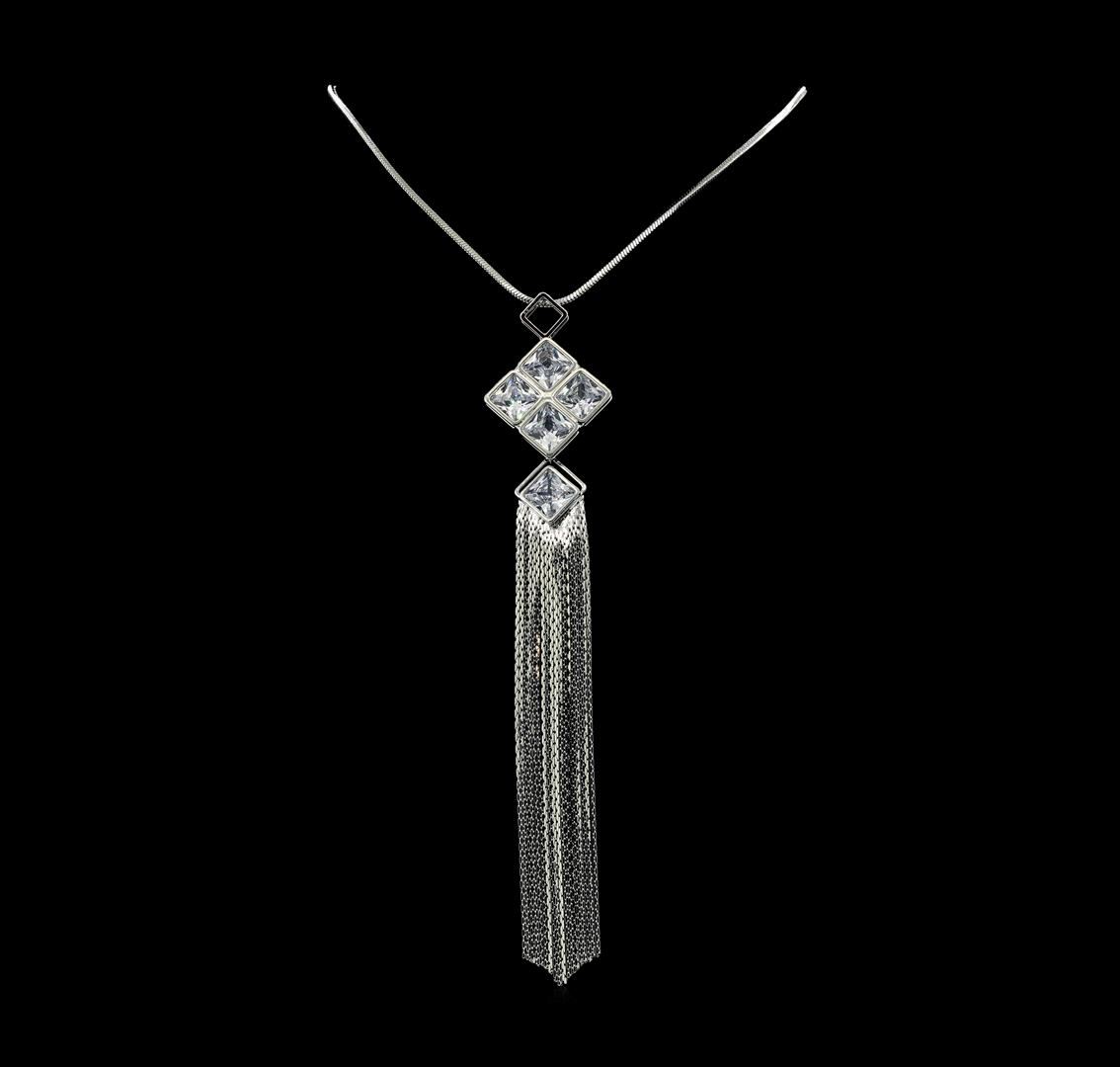 High end designer jewelry. Crystal Square Pendant Tassel Necklace - Rhodium Plated. Rhodium Pltd Chain Necklace. Silver/ Clear. 27/5.5inches.