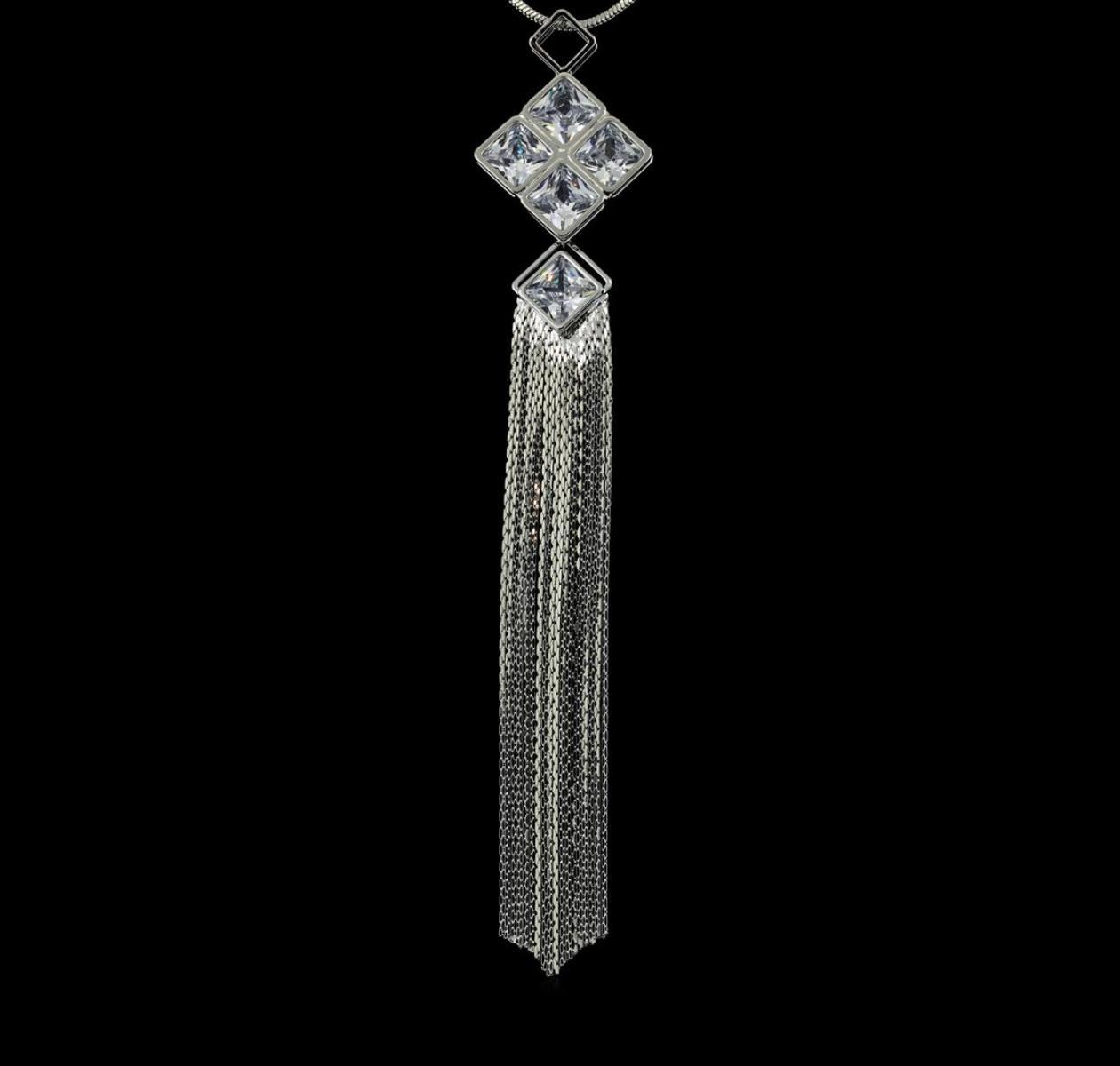 High end designer jewelry. Crystal Square Pendant Tassel Necklace - Rhodium Plated. Rhodium Pltd Chain Necklace. Silver/ Clear. 27/5.5inches.