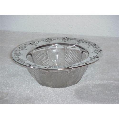 A glass and sterling silver bowl, 7 1/4" in diameter, 2 1/5" tall, the bowl is deeply etched  on each of the ten panels and on the polished bottom. The bowl is unmarked it has the quality of Heisey .  The silver rim is marked sterling and it does polish beautifully although there are some slight dents  but they do not lessen the beauty of the bowl. (1+)