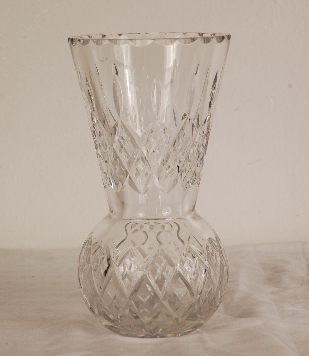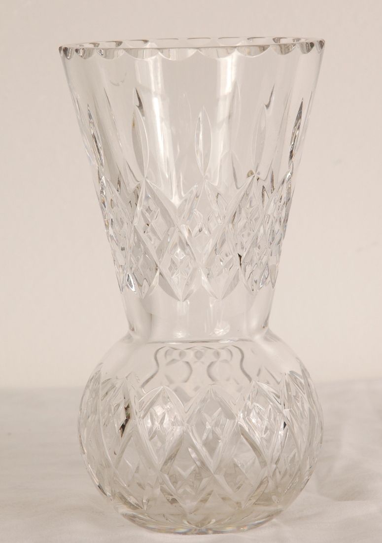 Carved crystal vase with linear accents. No chips or cracks. 4.5" Diameter.