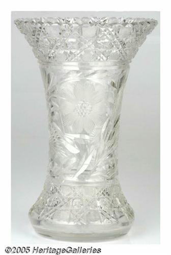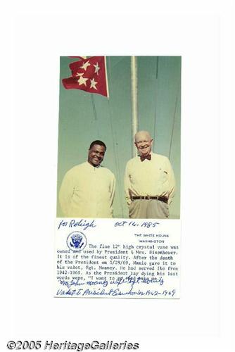 <B>Crystal Vase Used by President and Mrs. Dwight Eisenhower</B></I> This high quality 12" tall crystal vase was owned and used by the Eisenhowers. Following President Eisenhower's death on March 28, 1969, it was presented by Mamie to Ike's personal valet, John Moaney. Moaney served the President from 1942 until his death in 1969. Ike's dying words were, <I>"I want to go, God take me,"</B></I> according to an accompanying card signed by Moaney who detailed the circumstances of this elegant cut crystal vase. Lot:255