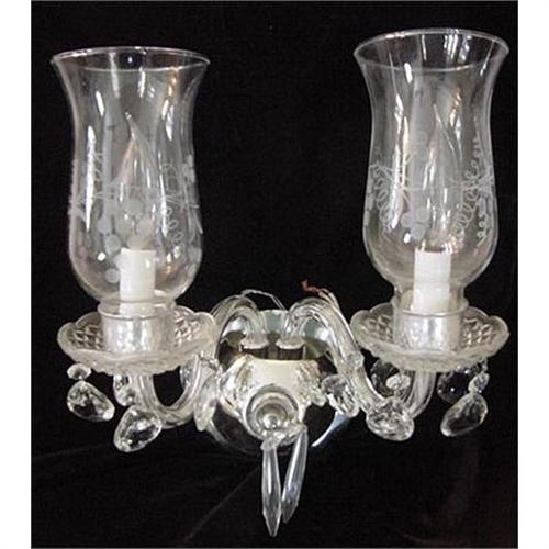10 inches across and 12 inches long. 2 Candle Style Lights in Etched Chimney, Each with Teardrop Crystals. Circa 1920s.