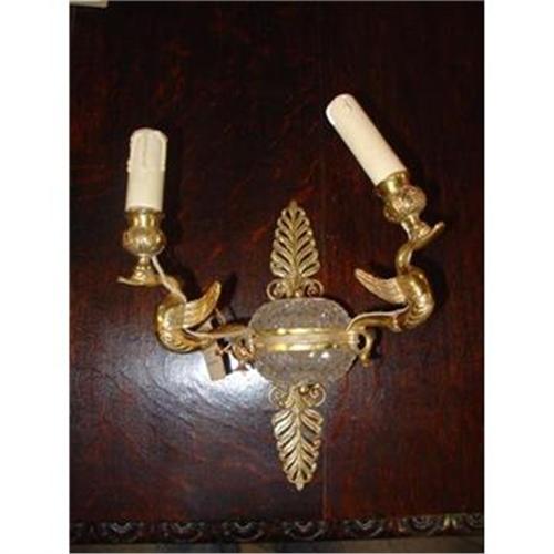 This is a French, Empire style crystal and bronze, 2 light sconce. It is in very good condition (except bent arm), and we believe it to be circa 1930's. This charming sconce has palmettes, swans, fleur-de-lys, urn shaped bobeches, and a central enclosed crystal ball. If you are looking for that Napoleonic feel in a fixture, this is for you. Please contact us concerning bent arm, as we will work with you.