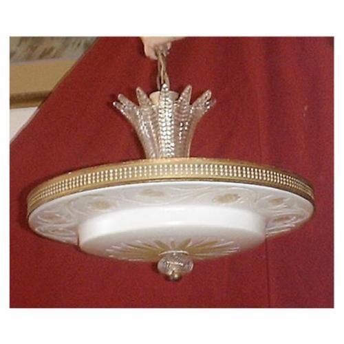 <table width="100%" border="0" cellspacing="0" cellpadding="4"><tr><td><em> Tiered Beautiful Antique</em></td></tr><tr> <td width="100%"> 1920-1930's Hanging Glass Electric Chandlier<p>Beautiful 2 tiered frosted white glass with gold colored etchings. <p>Decorative side brass banding 1 1/2" wide.The brass is in very good condition and is all in a cut work pattern so the light comes thru.<p>Made for Electric 3 seperate blub light.<p>First tier is etched with a sun-burst leaf design. Second tier is etched with flowers, alternating the front-view and side-view of the flower, and graceful flowing leaves.Very much like a reverse wedding cake.<p> On the bottom of the first tier, in the center, is a round swirled crystal ball with a brass button.<p>This Chandelier is topped with a fluted 5 1/2" pineapple type pressed glass standing leaf crown.<p>Measurements are: 16 1/2" in diameter, 11" tall. 20" chain with ceiling mount. Glass is 1/4" thick. Piece is heavy.<p>In excellent condition. The electric wiring needs to be replaced. For an additional charge, we will replace the wiring for you.<p>Every thing lines up perfectly straight hanging, it's a little off in the photos because it was heavy holding it for photos.<p> The lamp comes apart for shipping.<p>This wonderful old chandlier has class and makes a statement. </td></tr><tr> <td> </td></tr><tr> <td>Reference #: 1587</td></tr><tr><td>Condition:Excellent</td></tr><tr><td>Year:1920-1930's</td></tr><tr><td>Country:USA</td></tr><tr><td>Height:11</td></tr><tr><td>Width:16.5</td></tr><tr><td>Title:Crystal and Frosted Glass Chandlier</td></tr><tr><td>Materials:Glass,Brass,Crystal</td></tr><tr><td>Location:Deland, Florida</td></tr></table>