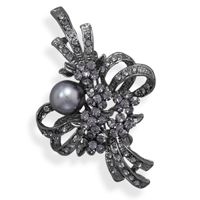 Black tone base metal ornate crystal and imitation pearl fashion pin. The smoky crystals range in size from 2mm - 3.5mm. The imitation grey pearl is approximately 12mm. The fashion pin measures approximately 41mm x 50mm. Fashion jewelry contains base metal.