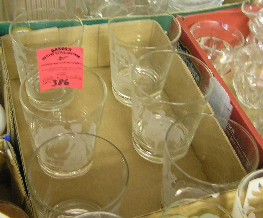 Set of six high quality etched crystal drinking glasses Victorian themed est. value $65.00-$75.00