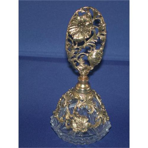 </font></strong>Crystal perfume bottle with intricate gold tone floral mount & stopper with crystal dip stick, in excellent condition.</font>