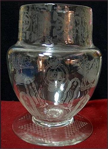 Crystal urn standing 8" tall with etched Masonic symbols covering the piece