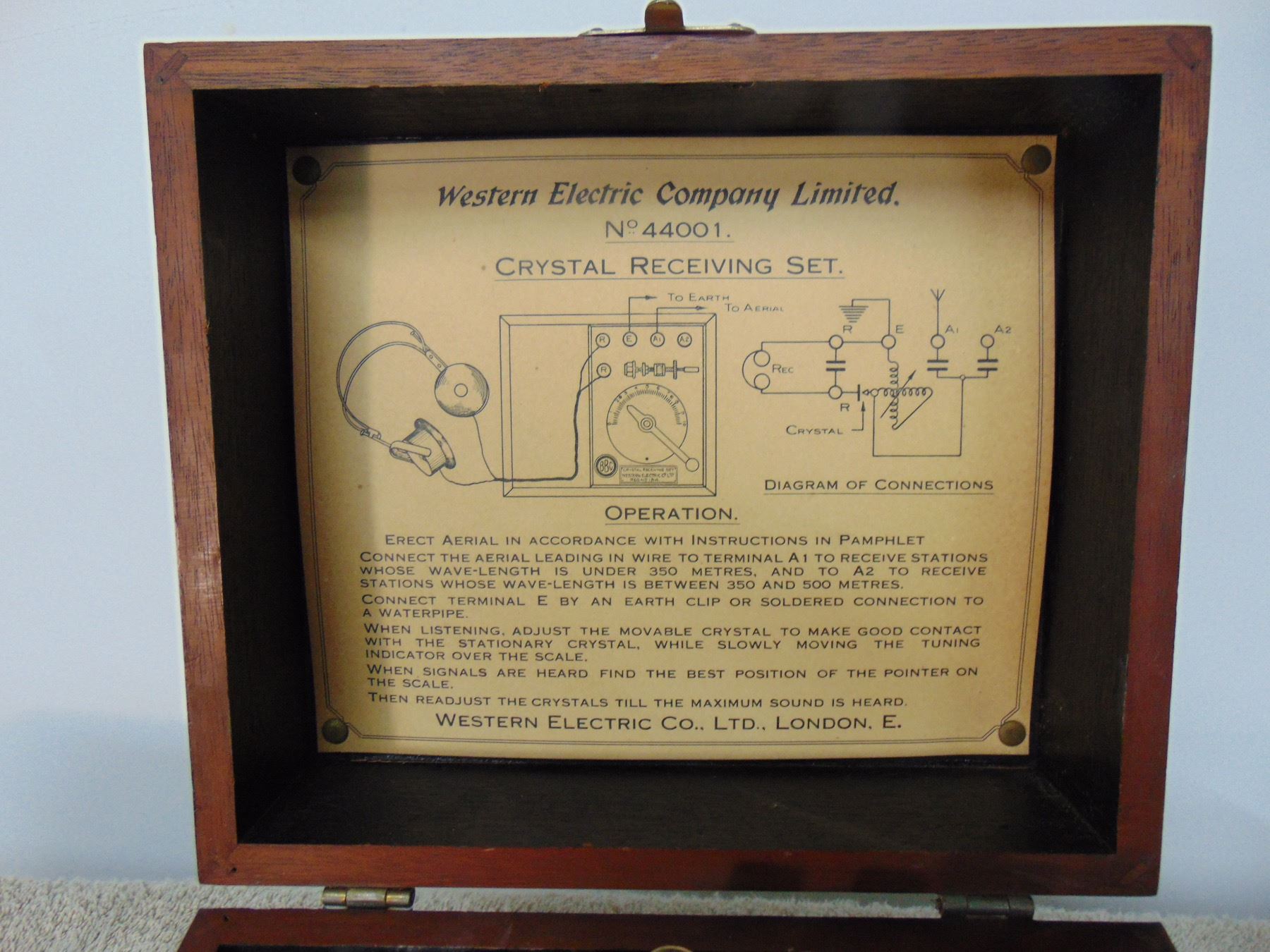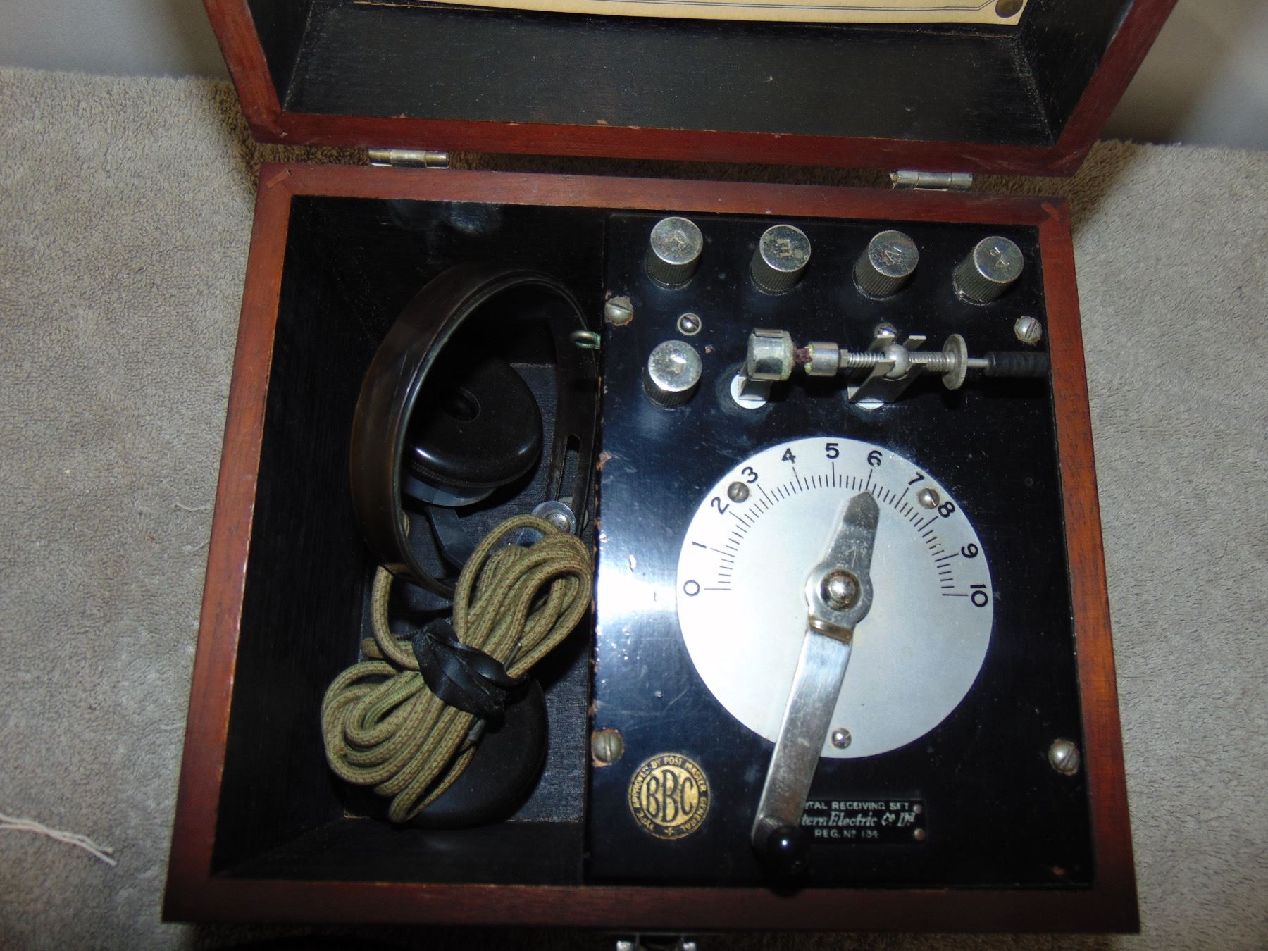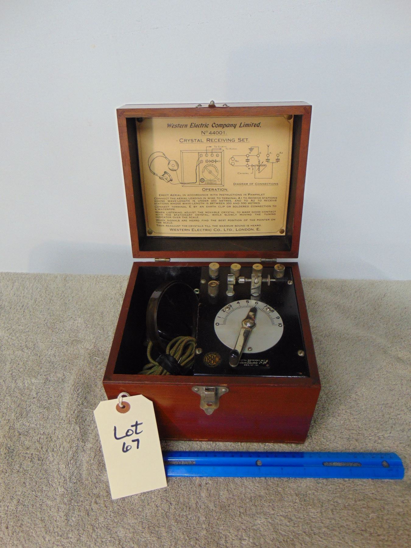 Western Electric English made crystal set; similar to Aeriola Jr.; BBC tag; includes set of French-made headphones; very nice