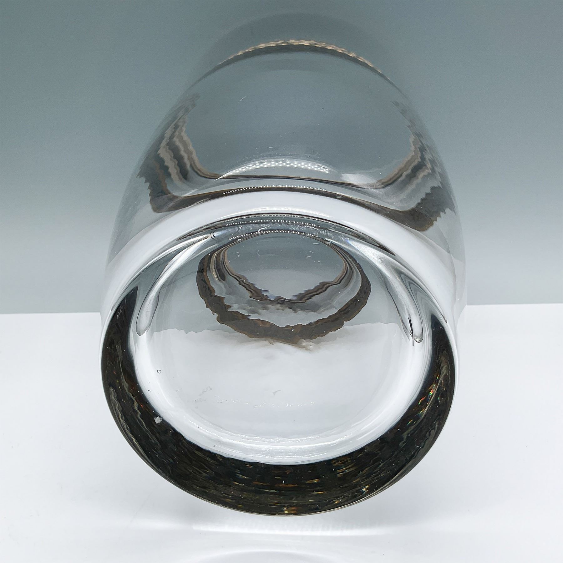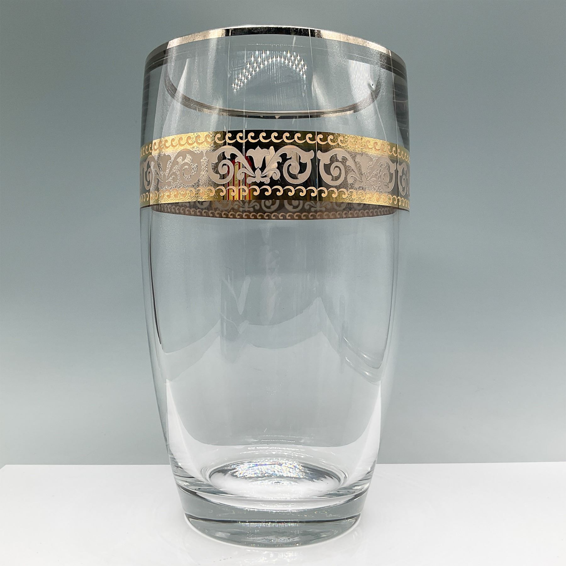 This fully handcrafted vase by Crystalex, made in Turkey, features an intricate etched gold and silver band with ornamental scrollwork. Measuring 11"H, the vase exhibits exceptional craftsmanship with its clear glass form and decorative metallic detailing, making it a stunning centerpiece. Crystalex backstamp present.