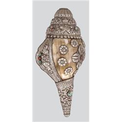 Tibet, 18 - 19. sz., kagyló, ezüstözött fém rátéttel, korall és türkiz díszítéssel, h: 28 cm