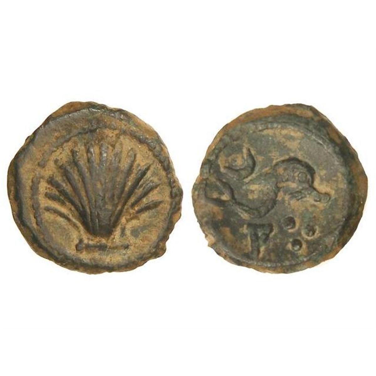 Cuadrante. - ARSE. - Anv.: Concha. Rev.: Delfín a derecha, encima creciente, debajo A y tres puntos. 3,75 grs. Pátina verde. AB-2054. MBC+. - -