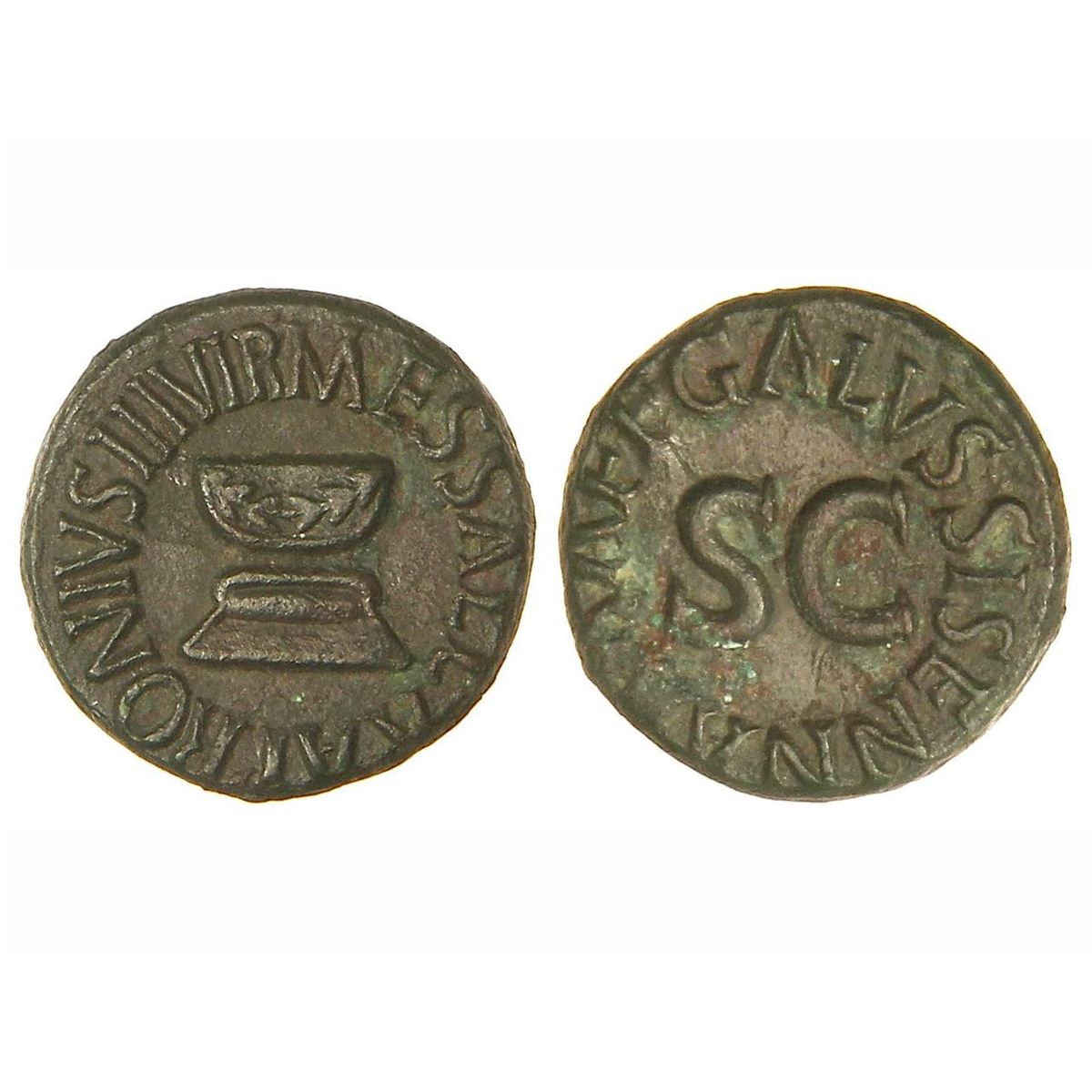 Cuadrante. - Acuñada el 5 a.C. - AUGUSTO. - Anv.: APRONIVS MESSALLA III VIR. Altar. Rev.: GALVS SISENNA AAA FF. alrededor de S. C. 3,30 grs. AE. Pátina oscura. ESCASA. C-352. MBC-/MBC+. - -