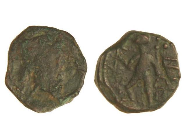 Cuadrante. - BILBILIS. - Anv.: Cabeza con casco a derecha. Rev.: Figura a derecha con un brazo sosteniendo un instrumento, encima tres glóbulos y delante BiL. 3 grs. Pátina oscura. ESCASA. AB-273; Vill-19. BC/MBC+. - -
